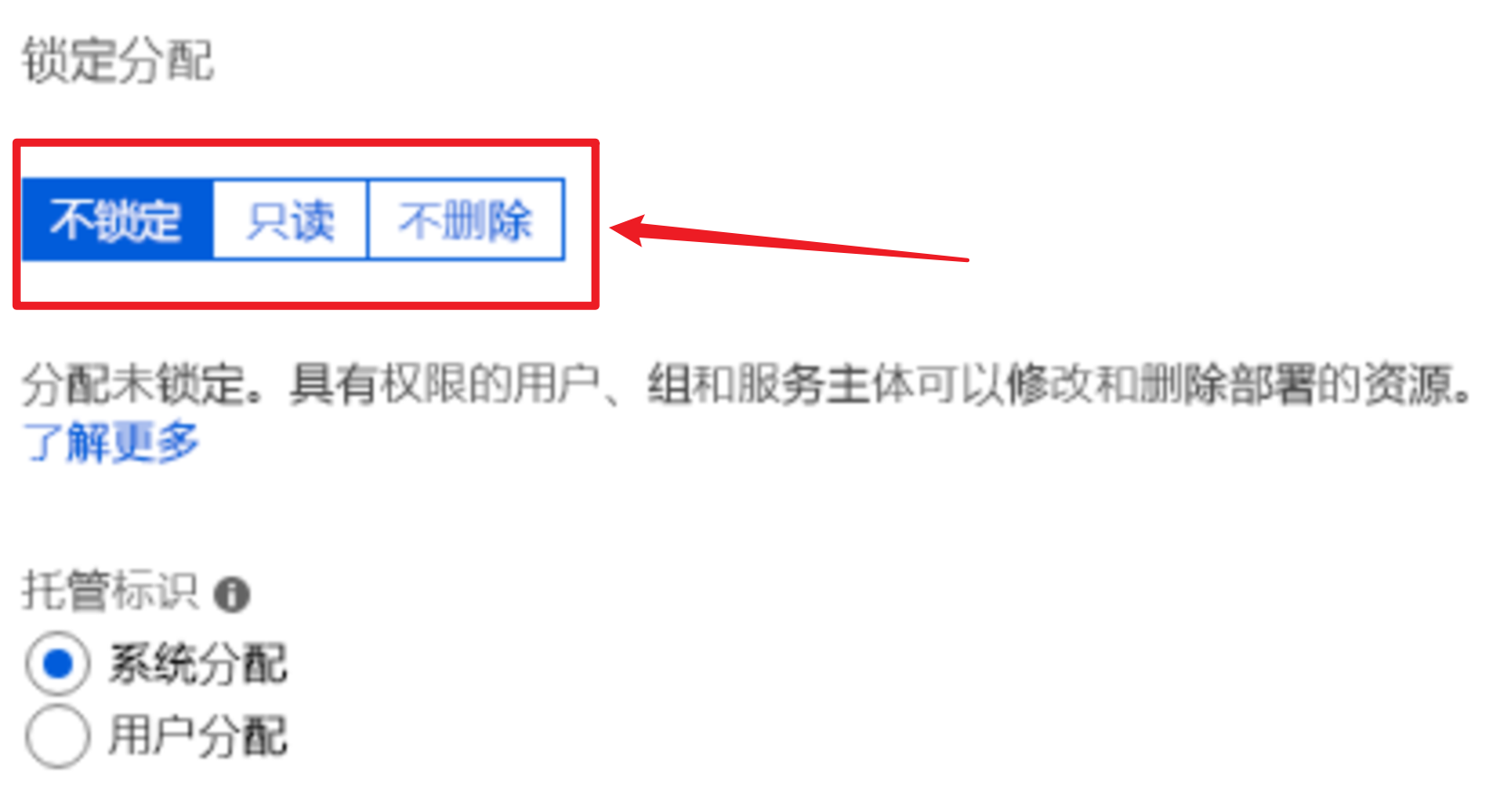 在蓝图(Blueprint)的锁定模式和状态的介绍文档中,锁定模式适用于蓝图分配,具有三个选项:“不锁定”、“只读”或“不删除”。由蓝图分配中的项目创建的资源有四种状态:“未锁定”、“只读”、“无法编辑/删除”或“无法删除”。当在创建对资源进行“拒绝分配”权限的操作中,同样也是只能对其进行三种操作【“不锁定”、“只读”或“不删除”】。