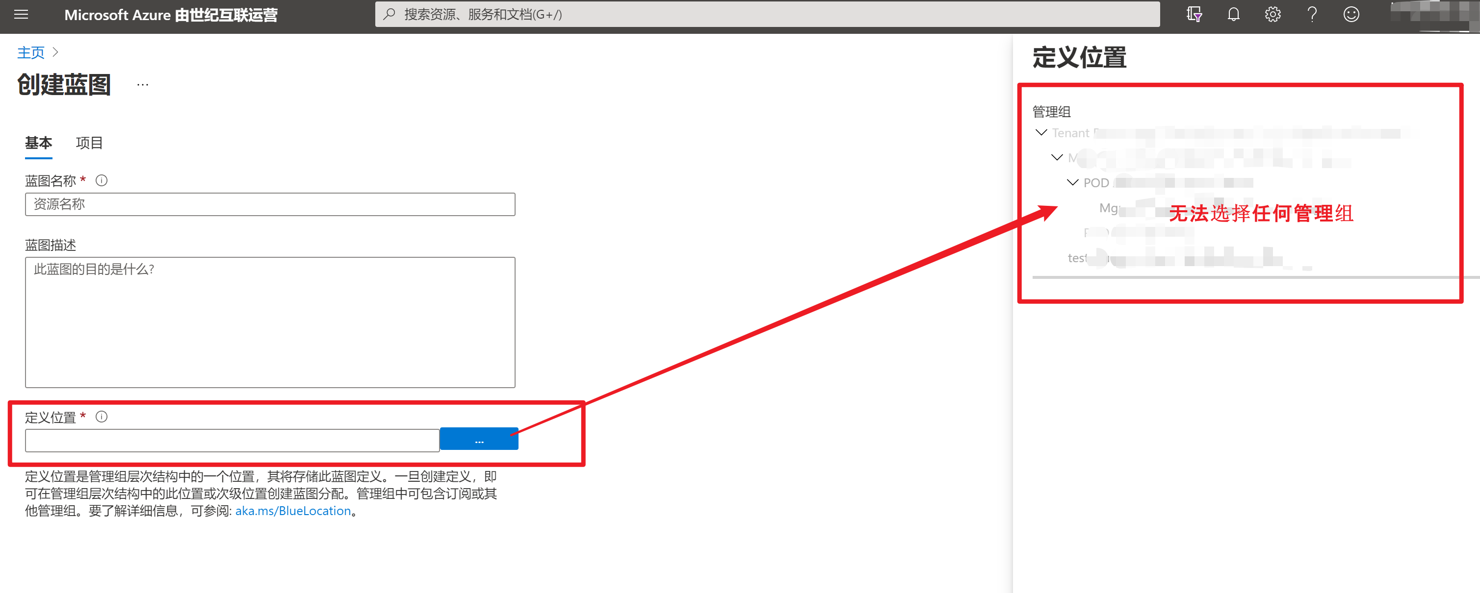 - 没有启用Azure资源访问管理时候的蓝图”定义位置“列表无法选择