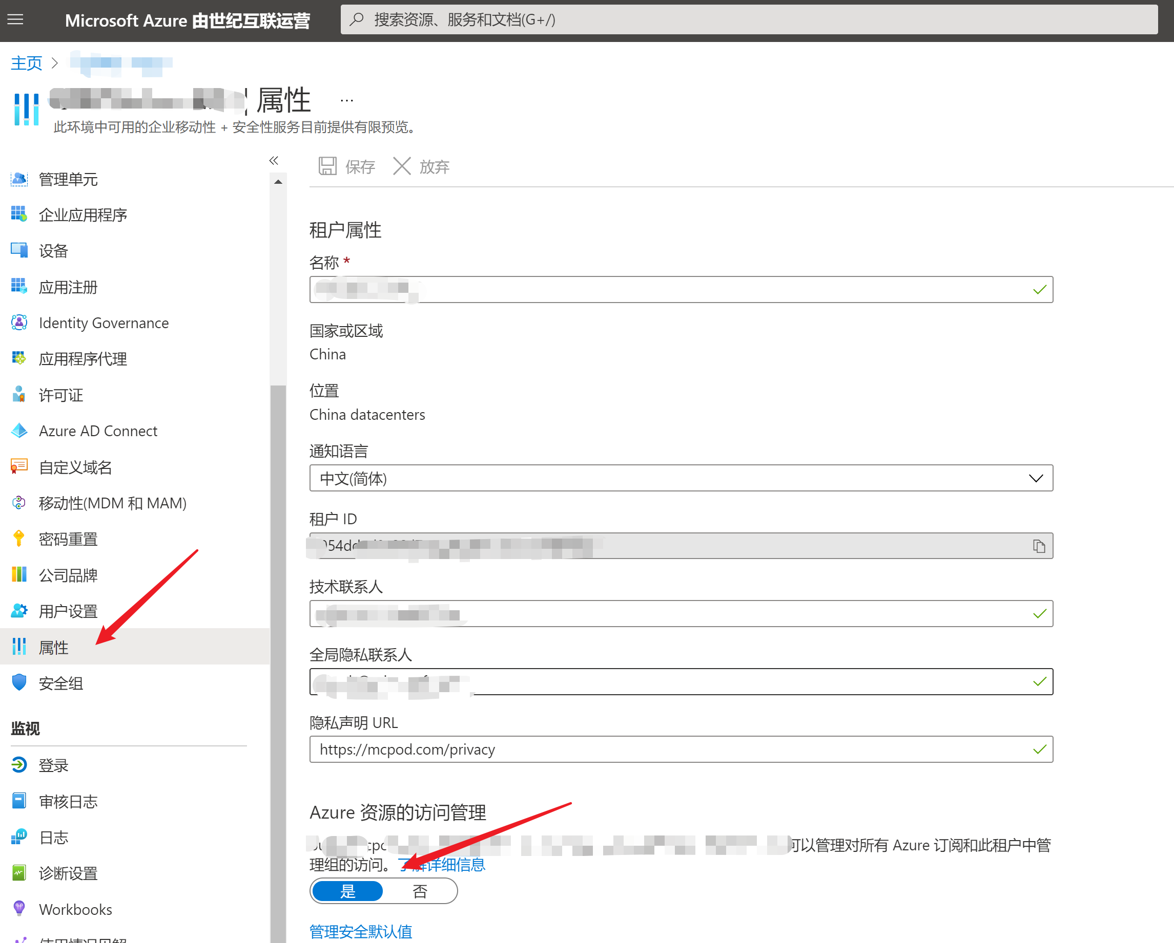 在”Azure 资源的访问管理“设置中,选择是。