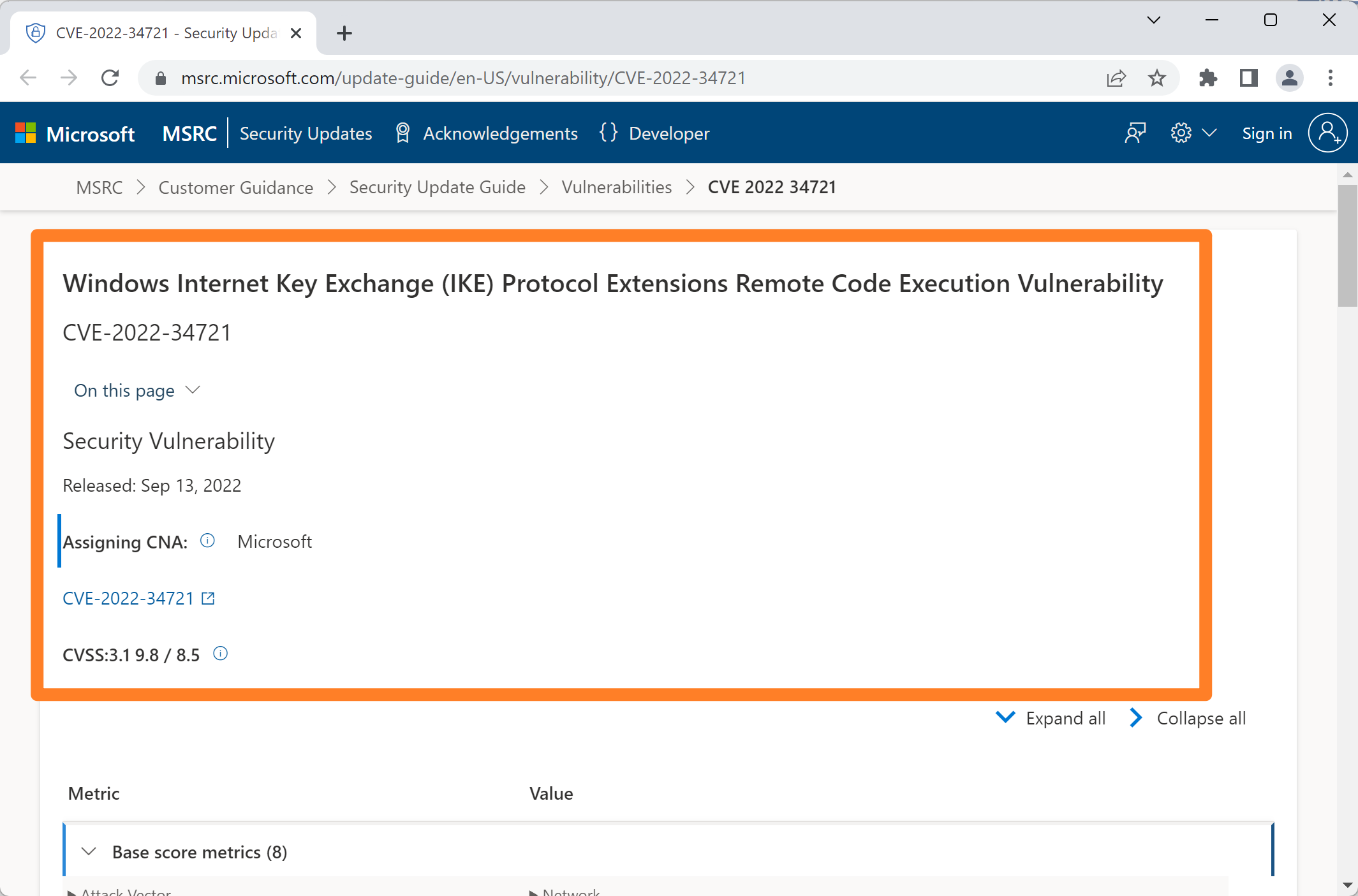 当Windows发布新的安全漏洞后,会根据安全漏洞的级别分类来确定是紧急打补丁升级,还是每一月的补丁日( 每月第二周的星期二)来统一推送补丁。 比如最近的一个安全漏洞(9月13号发布) CVE-2022-34721 : Windows Internet Key Exchange (IKE) Protocol Extensions Remote Code Execution Vulnerability (Windows Internet 密钥交换 (IKE) 协议扩展远程代码执行漏洞).