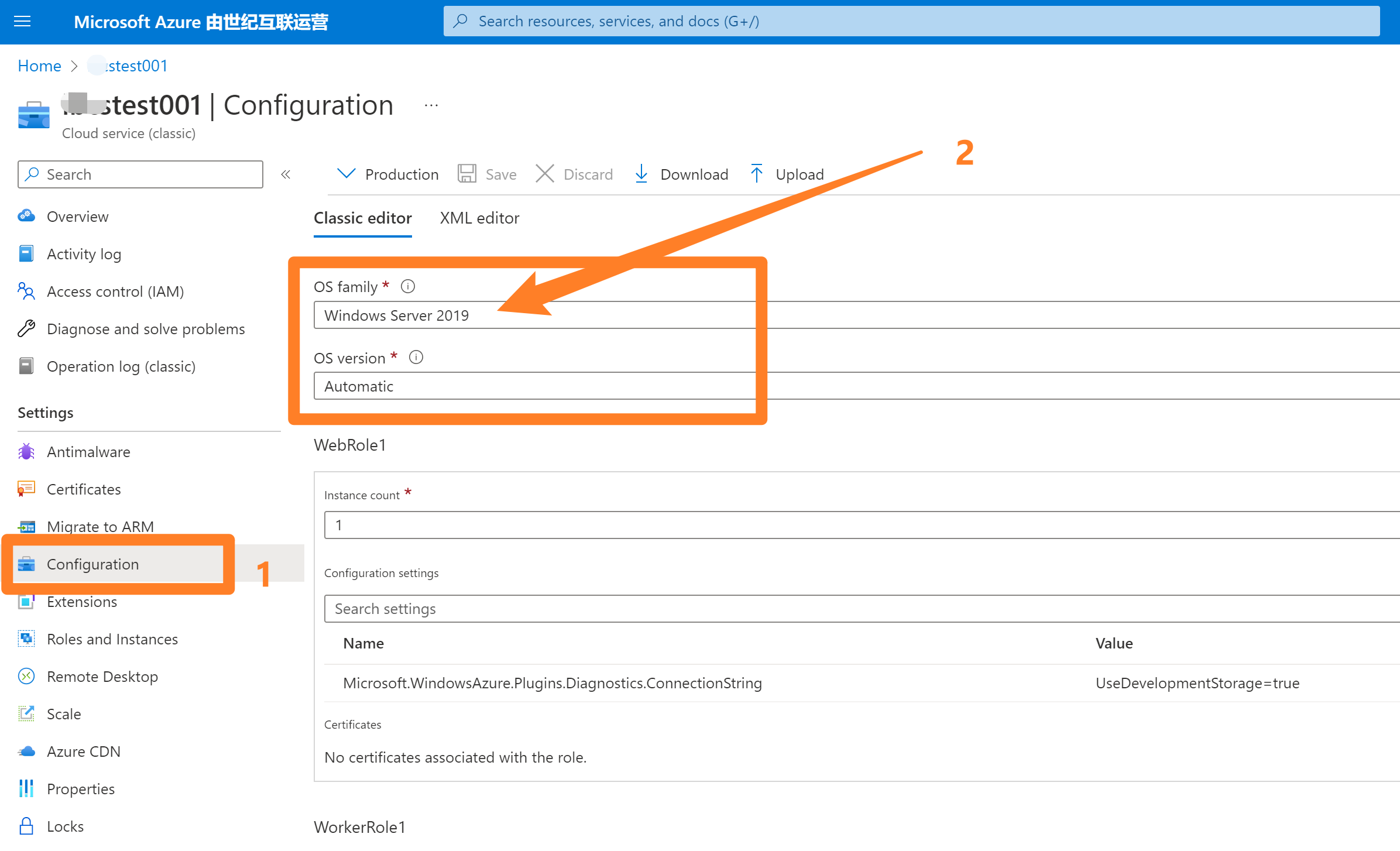 **首先:**需要进入Azure Cloud Service 门户页面中,查看当前云服务所使用的Windows版本号。如Windows Server 2019