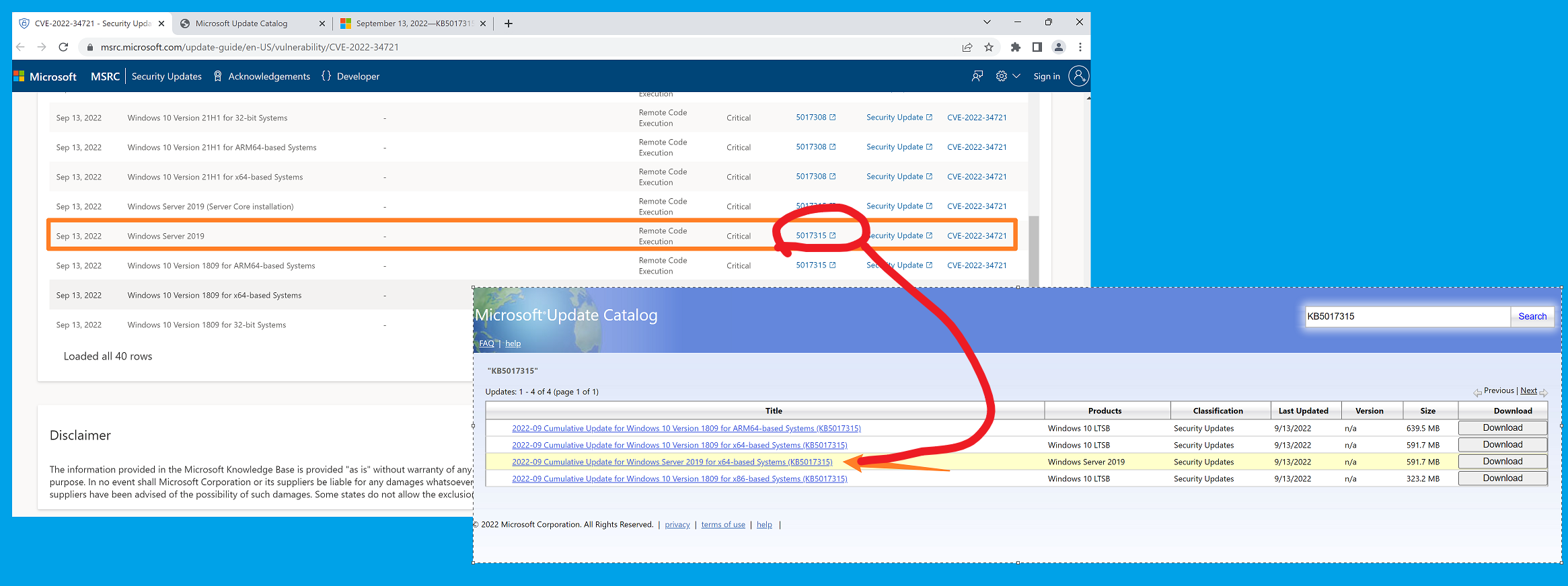 **然后:**通过官方公布漏洞的修复补丁列表,查询到云服务对应的补丁号:如 CVE-2022-34721 对 Windows Server 2019 的修补补丁升级包为 KB5017315