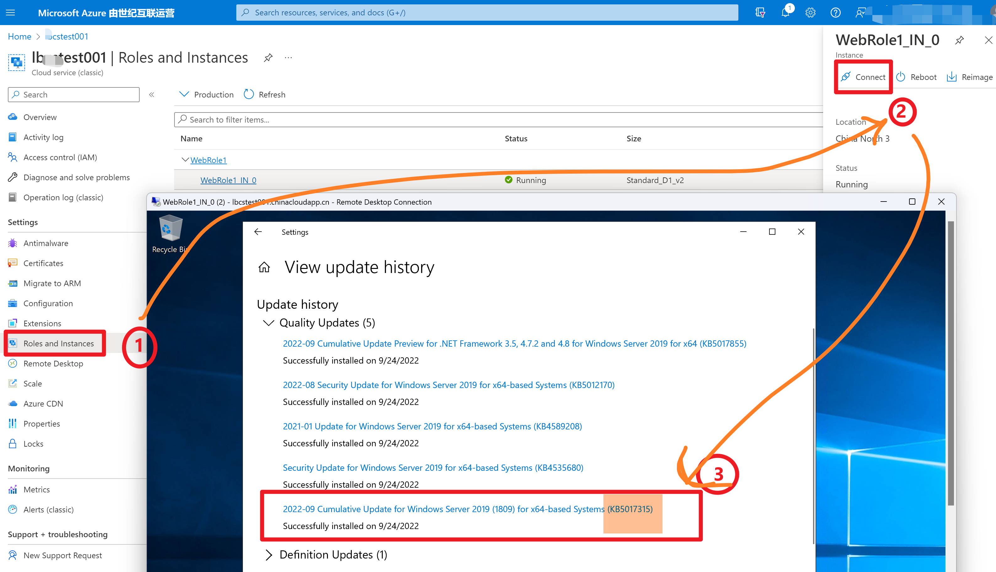 **最后:**通过远程登录桌面进入Cloud Service的实例中,通过查看Windows Update History记录,是否包含KB5017315判断是否已经修复漏洞