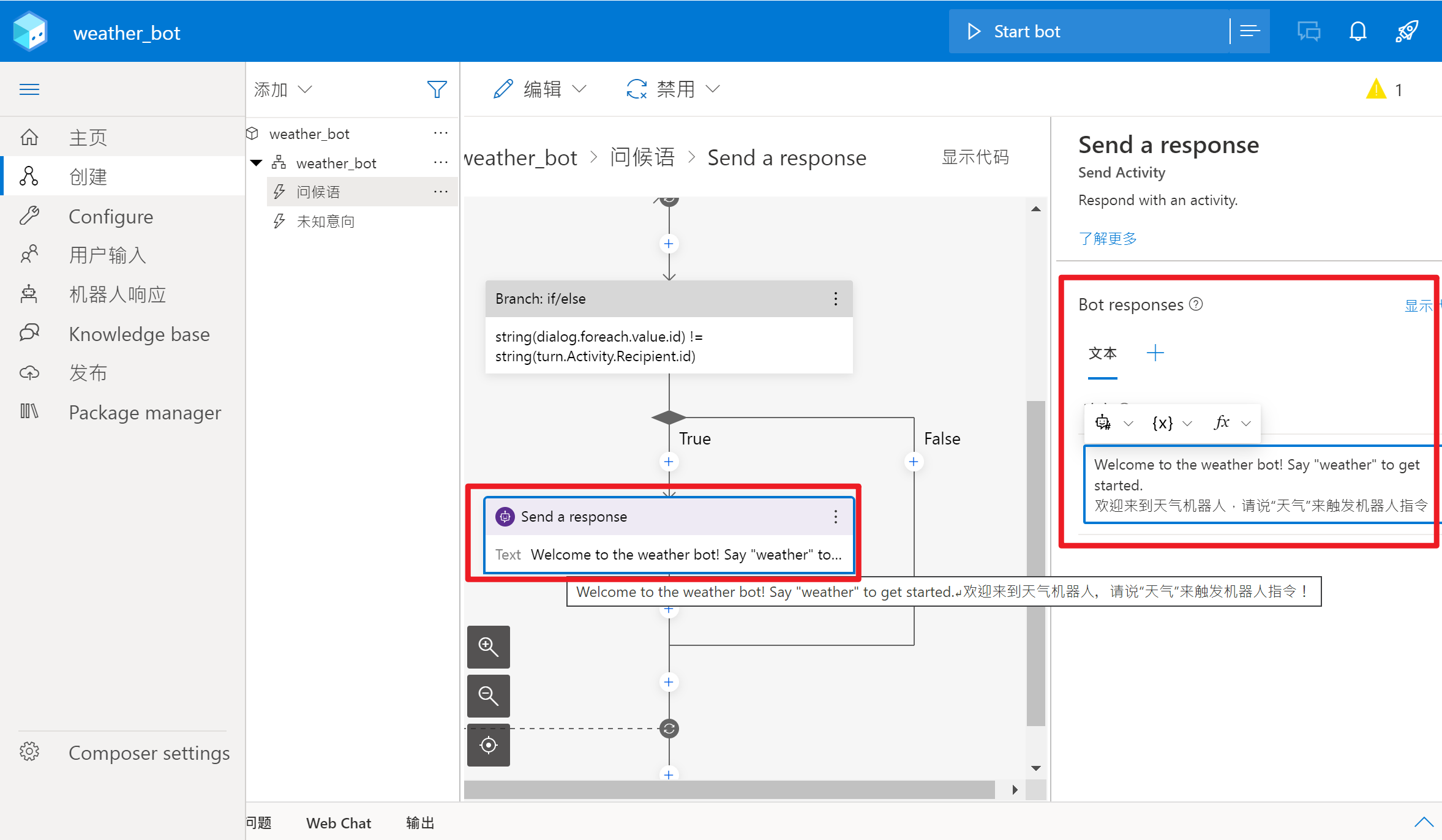 **第三步:**在BeginDialog的对话事件中,点击“+”号,添加一个“Send a response”,在它的“文本”属性中输入以下内容