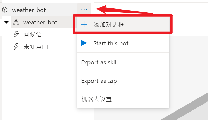 **第一步:**选中“weather_bot”机器人,点击“...” 选中“+ 添加对话框”