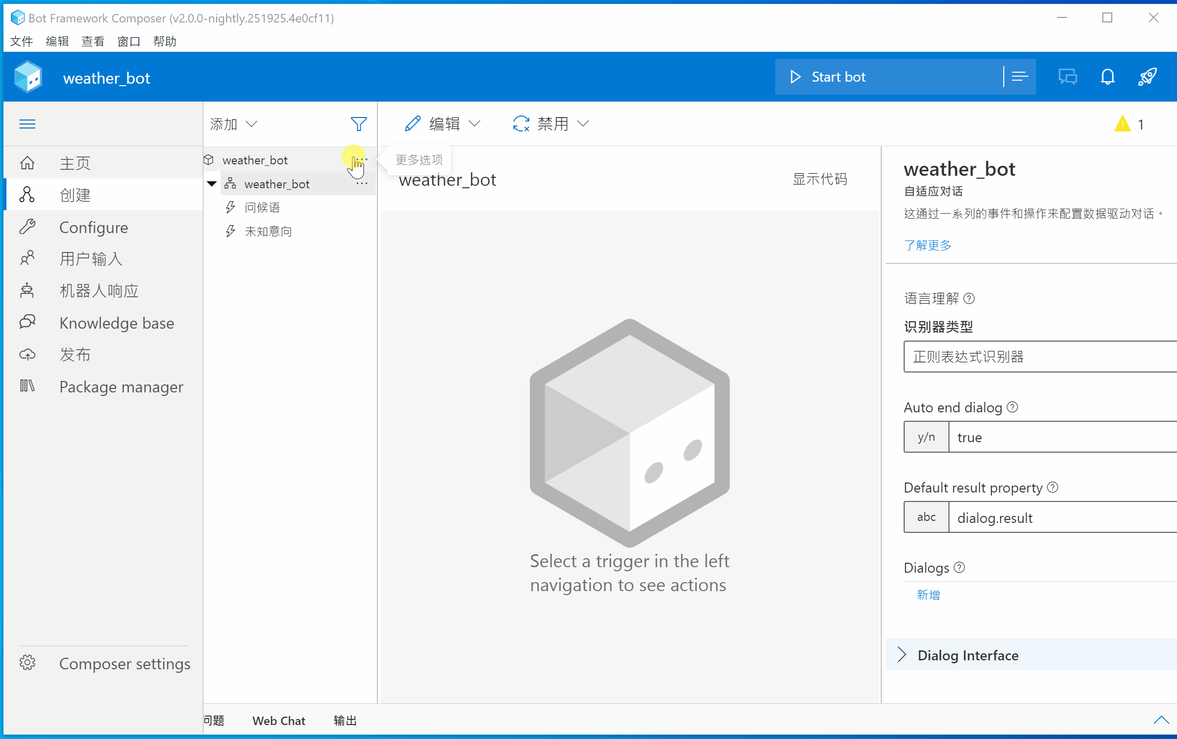 **第四步:**添加getWeather对话的触发器。重新选中“weather_bot”, 在右边的属性中改变识别器类型。由“默认识别器”改为“正则表达式识别器”