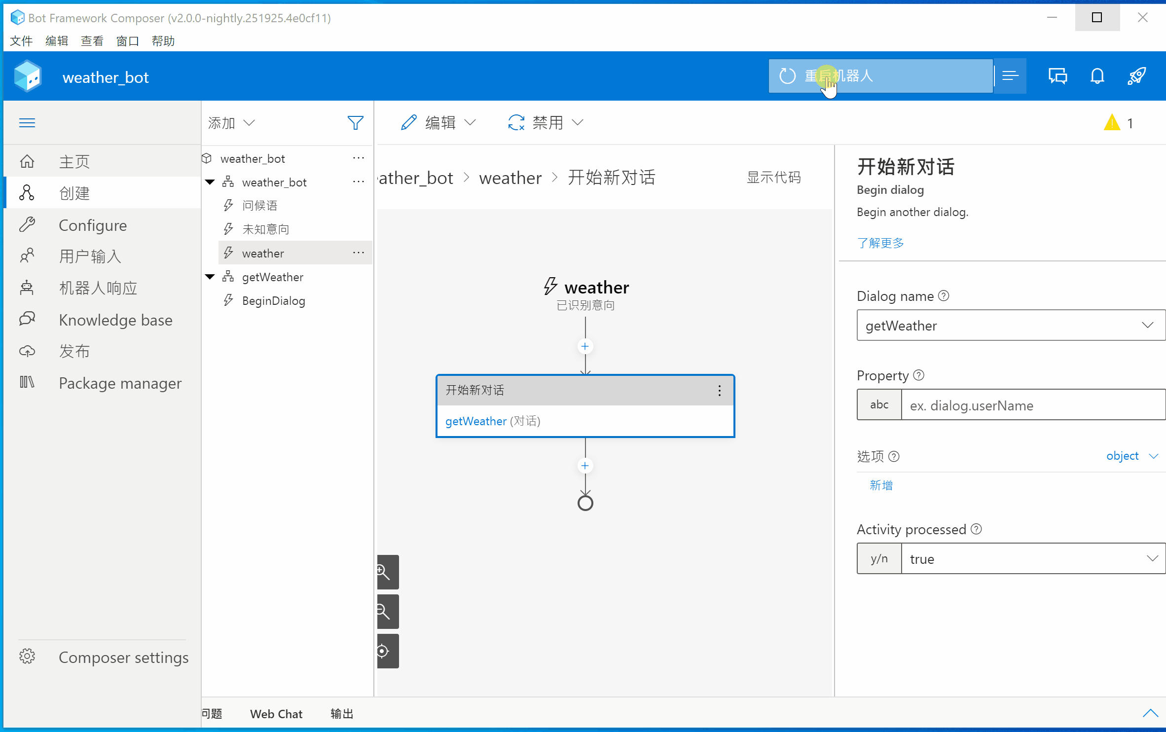 **第八步:**在右边的属性栏中,在对话框名称下列框中选择第二步所创建的getWeather对话框。