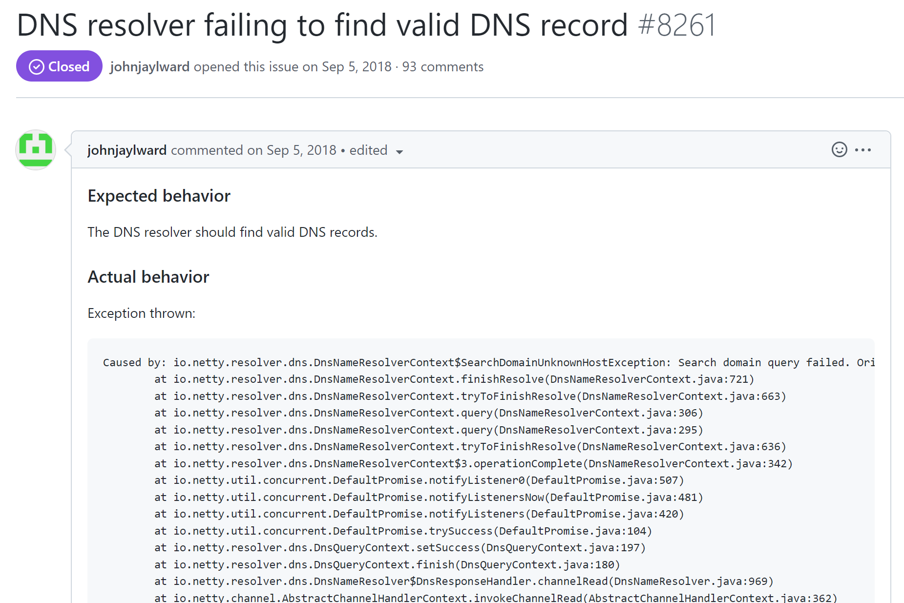 DNS resolver failing to find valid DNS record : https://github.com/netty/netty/issues/8261