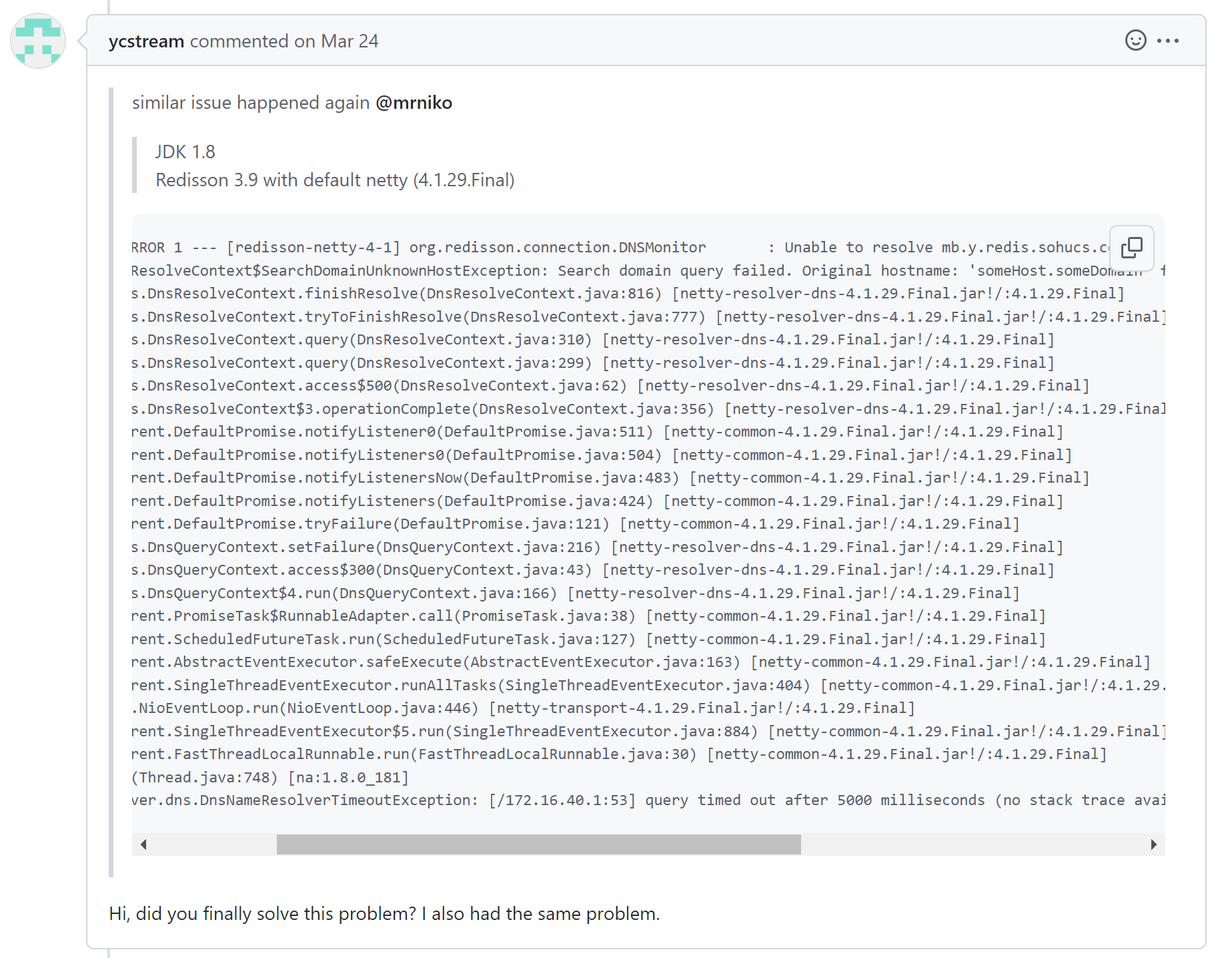 在Java项目中,使用Redisson作为连接Redis的客户端,间歇性的出现了DNS Monitor throwable 错误。