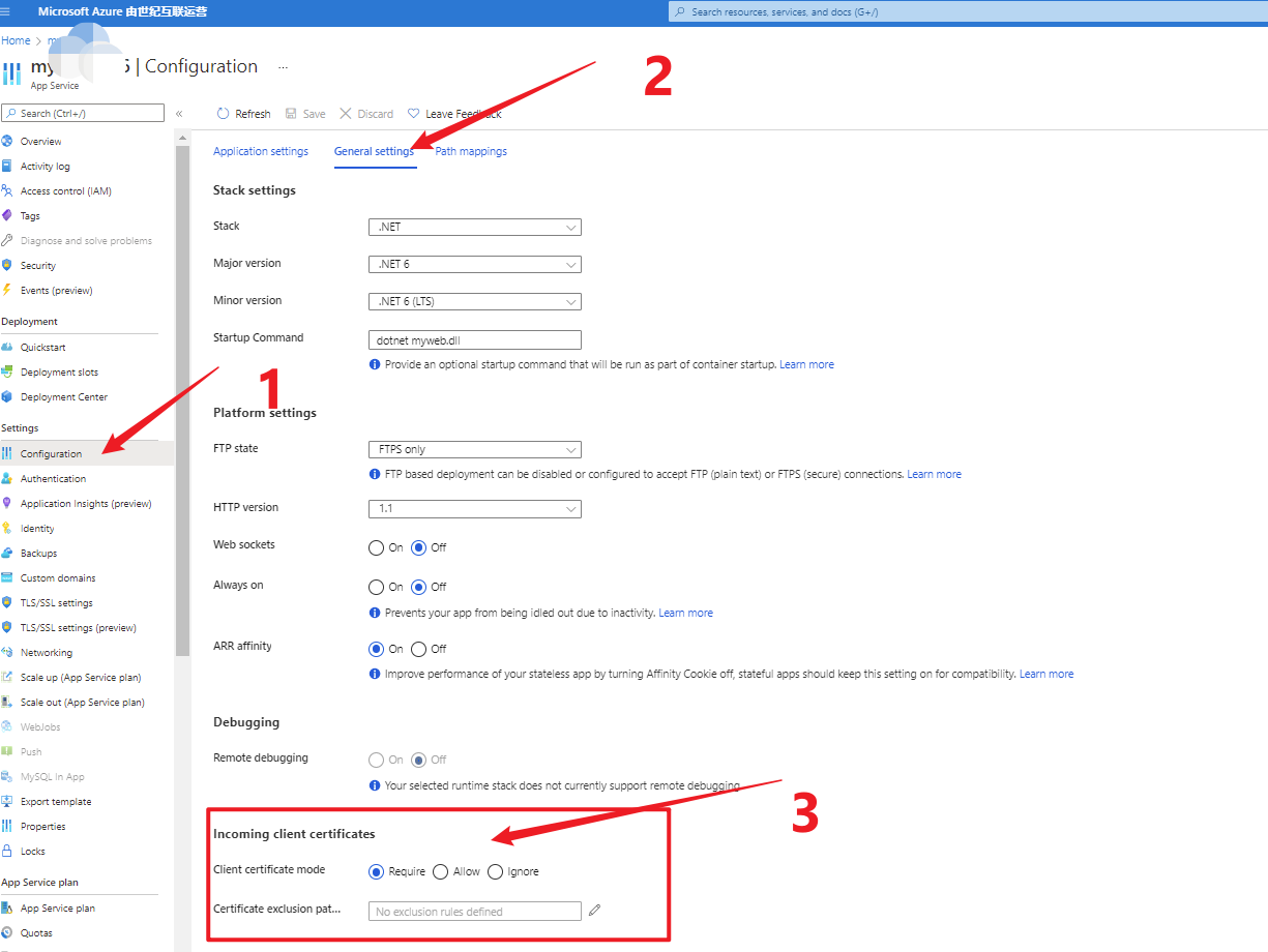在App Service的配置页面 (General Settings)中,可以开启Client Certificate Mode为Require(它的默认值为Ignore)。这样在第一次访问时候,客户端会要求从本地选择一个客户端证书。