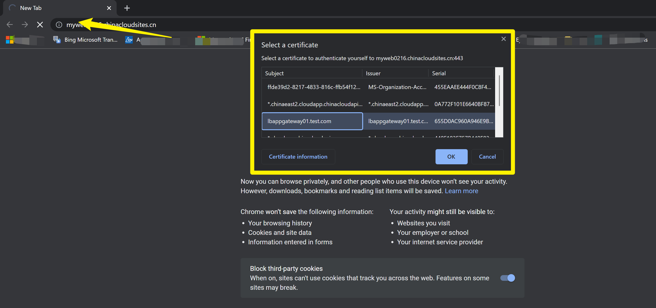 当访问App Service时,浏览器就会自动弹出选择证书窗口: