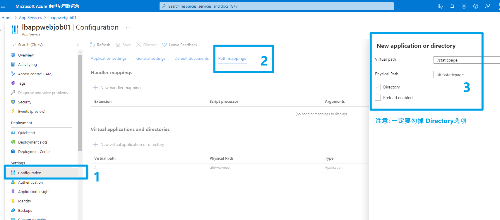 1:在App Service的门户中,通过Configration 的 Path Mappings来实现,如图:
