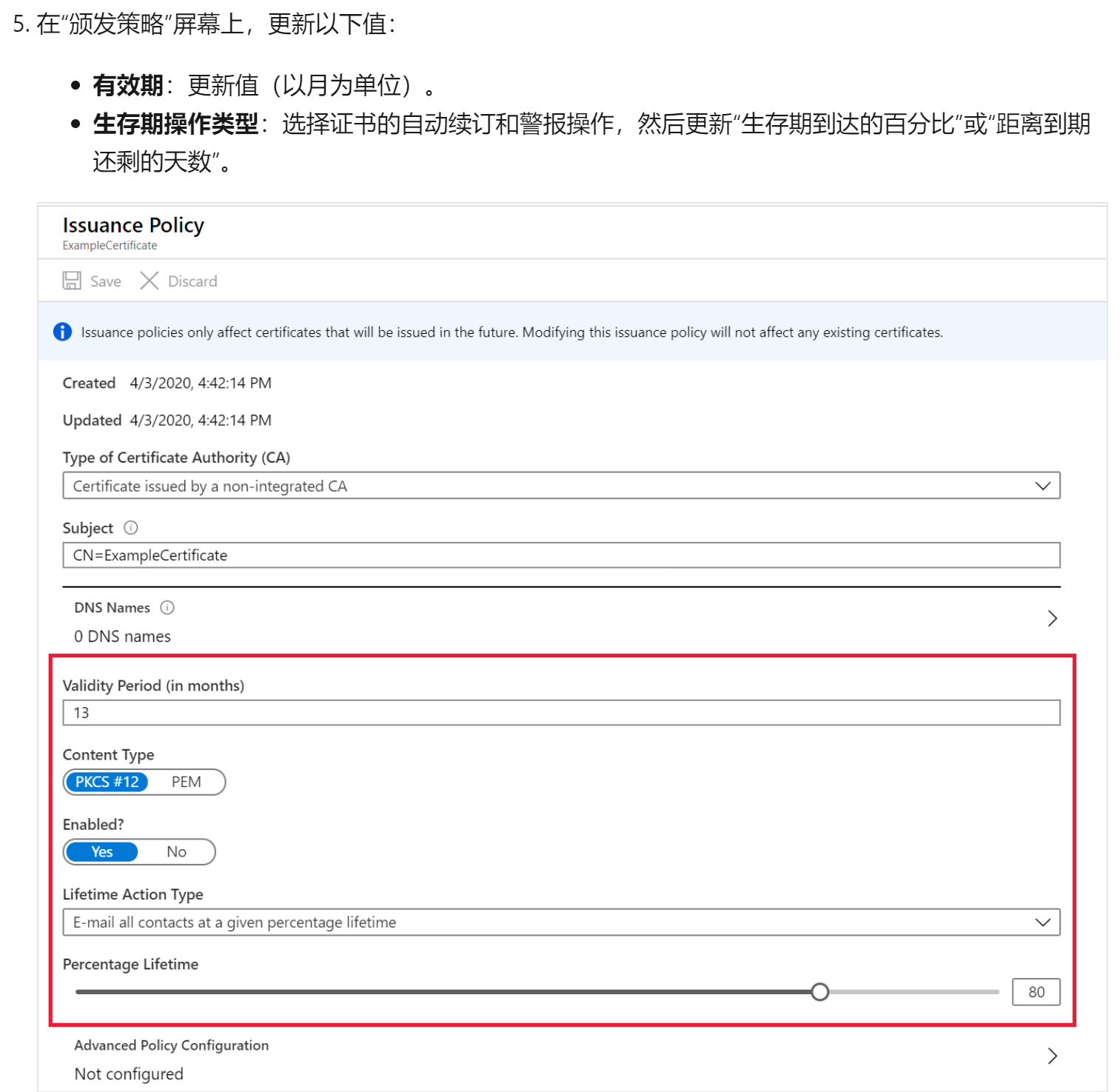 更新已存储证书的生命周期属性:https://docs.azure.cn/zh-cn/key-vault/certificates/tutorial-rotate-certificates#update-lifecycle-attributes-of-a-stored-certificate
