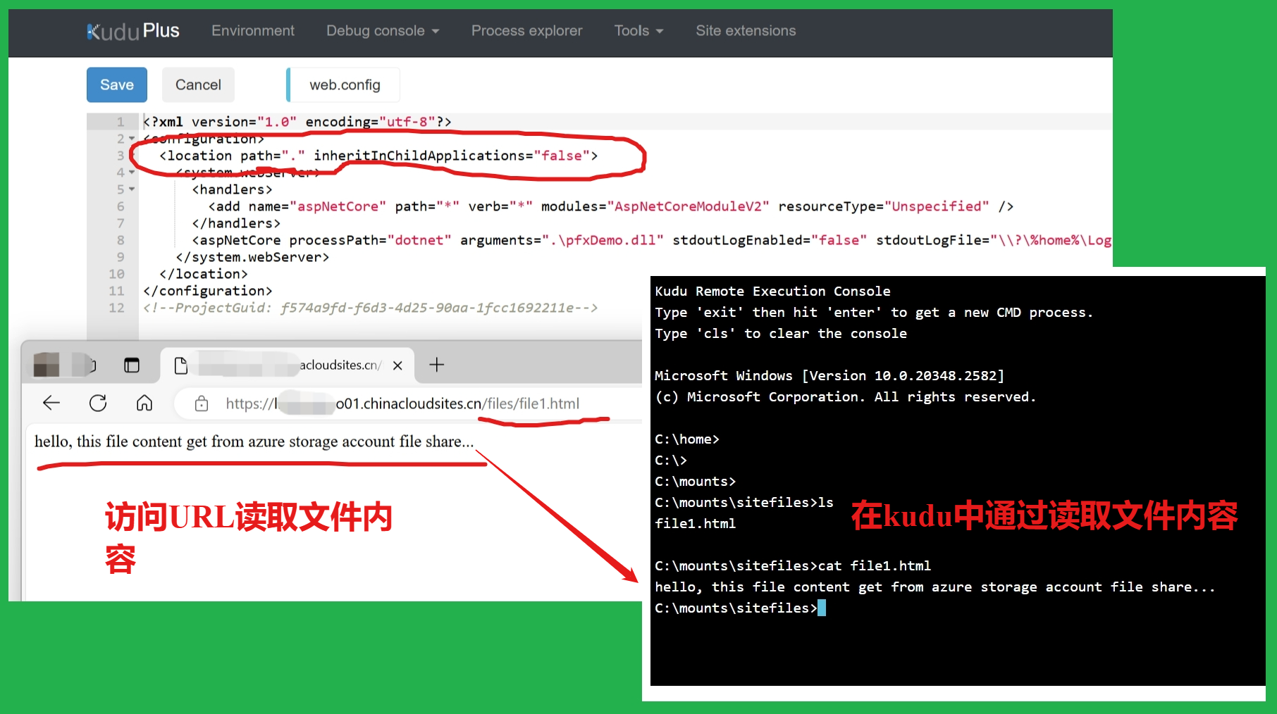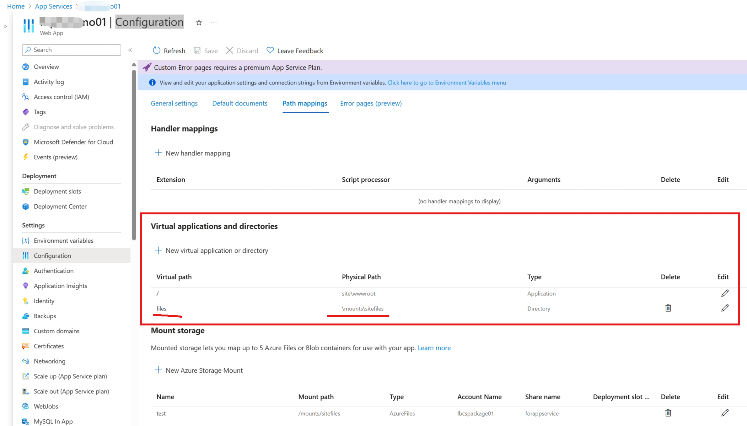 在App Service Windows的环境中,想一个App Services下部署多个站点,比如/根目录下,从wwwroot中读取项目文件,而 /files 则通过配置的虚拟目录来读取 \mounts\sitefiles 目录中的静态文件。