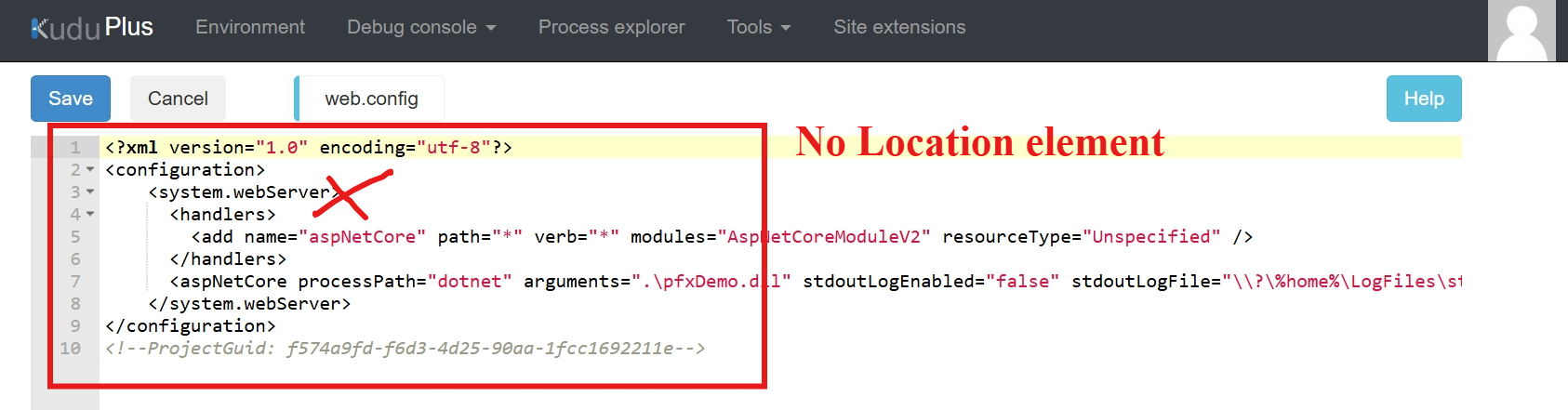 查看当前App Service的web.config文件内容,恰好缺少了location节点信息。