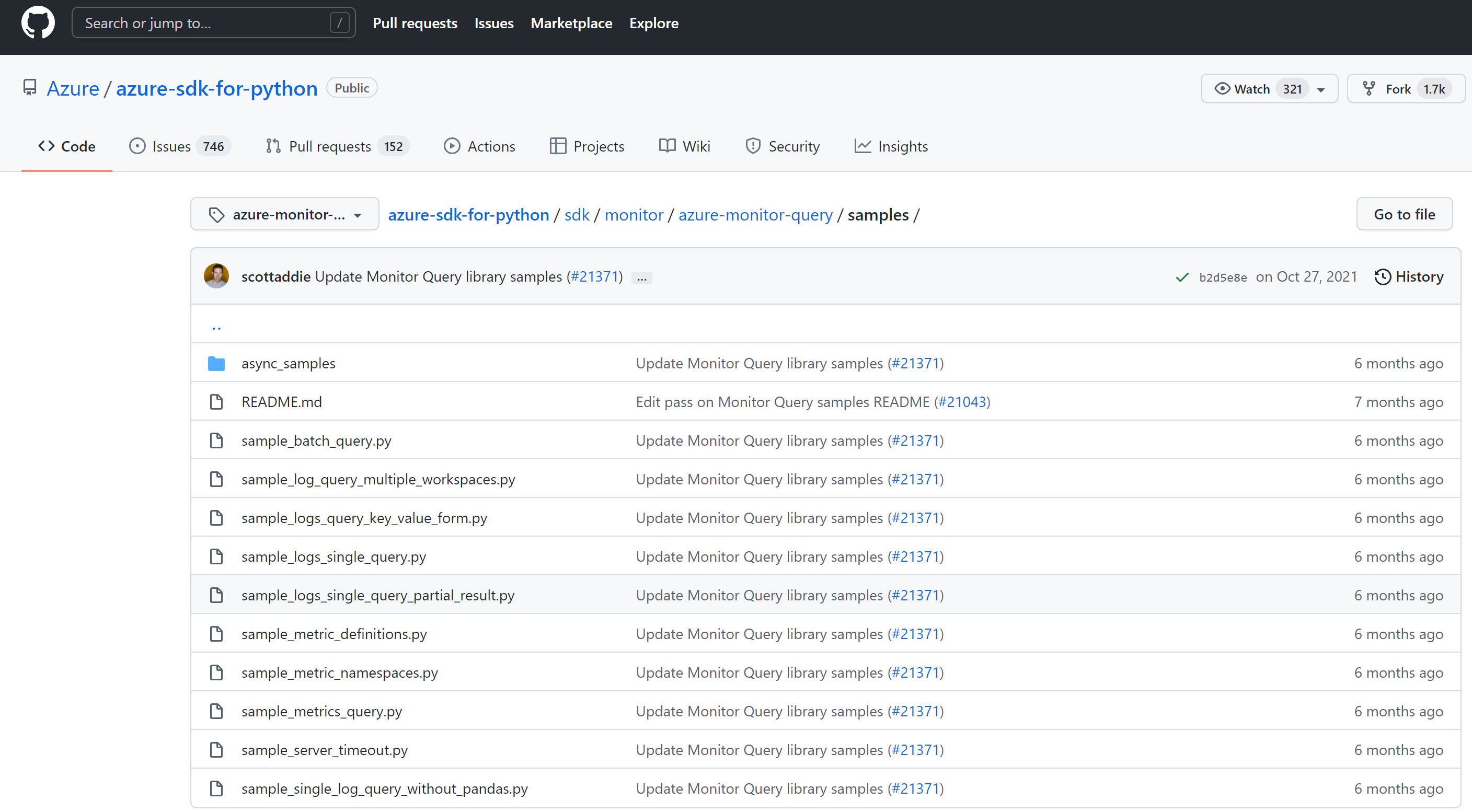 - Clone azure-sdk-for-python (https://github.com/Azure/azure-sdk-for-python/tree/azure-monitor-query_1.0.1/sdk/monitor/azure-monitor-query/samples)并在Source中查看对应Provider的示例代码