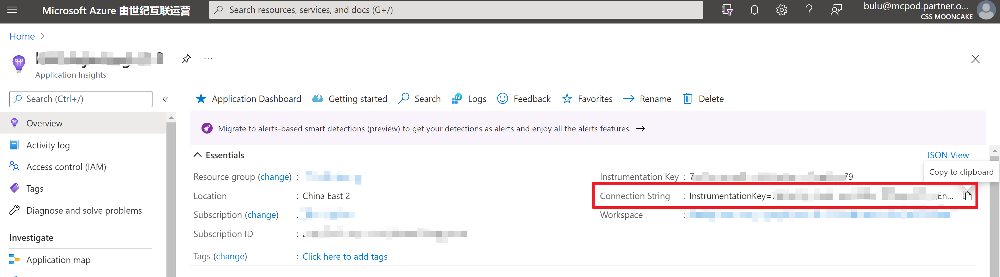 可以在 Application Insights 资源中找到连接字符串: