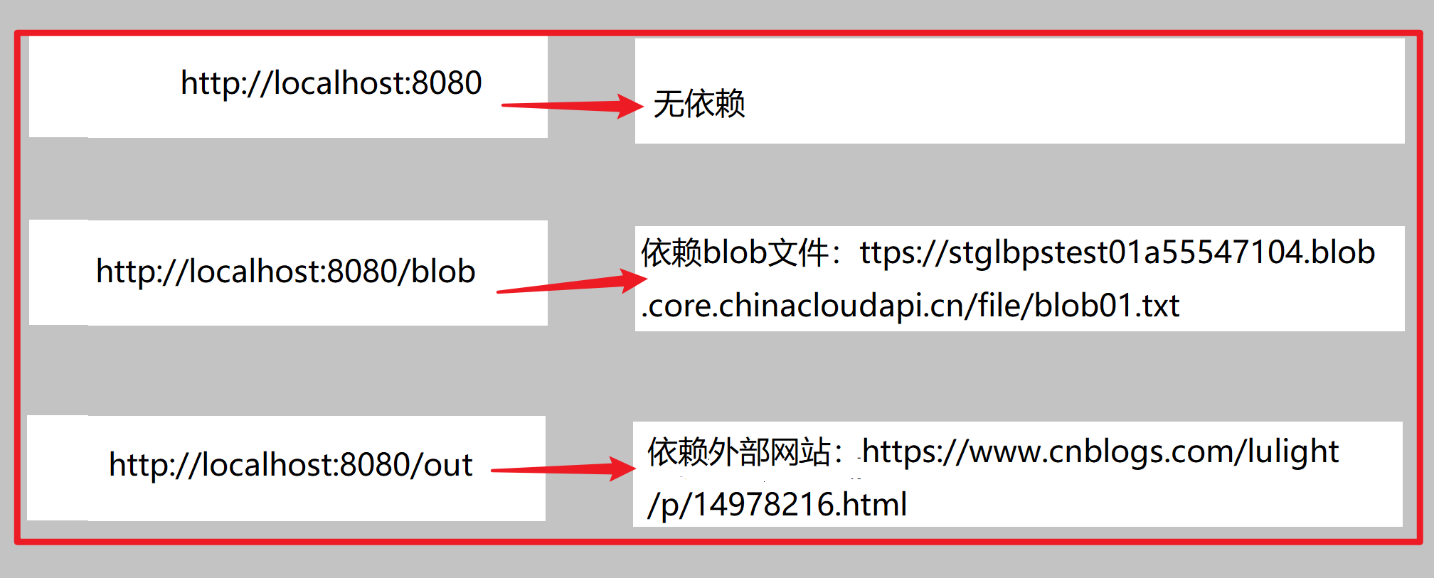 在本示例中,本Java应用有三个请求。http://localhost:8080, http://localhost:8080/blob 和http://localhost:8080/out。 三个请求的依赖项如下图: