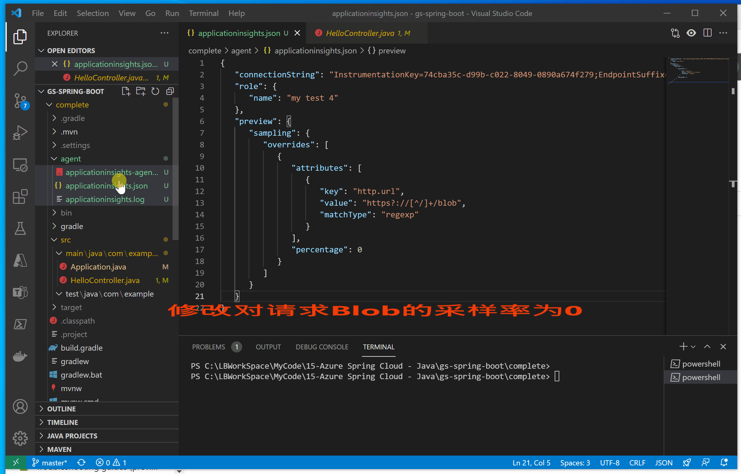 Sampling有两种方式:一种是应用的所有请求采样率都下降,不要100%采集。 修改方式为在* applicationinsights.json* 文件中设置sampling的值。如下修改采样率为50%.