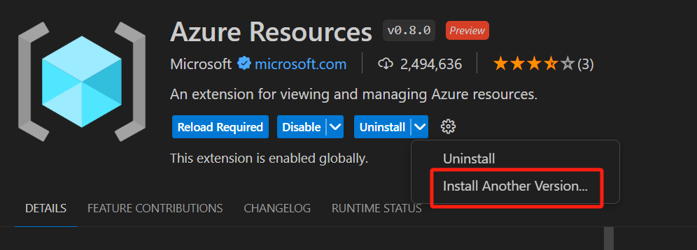 通过手动安装的方式把VS Code中的Azure Resource插件版本从v0.8.0 降到 v0.7.5。