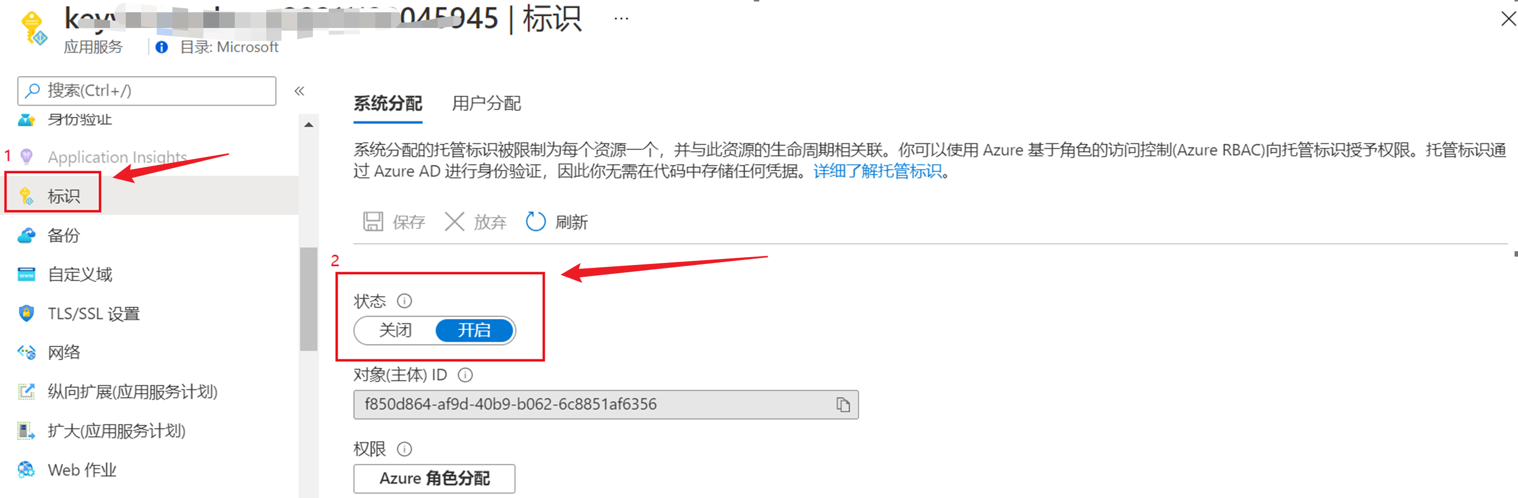 2) 在App Service 页面中启用系统分配的托管标识。当然,这一步也可以使用用户创建的托管标识: https://learn.microsoft.com/zh-cn/azure/active-directory/managed-identities-azure-resources/overview#managed-identity-types
