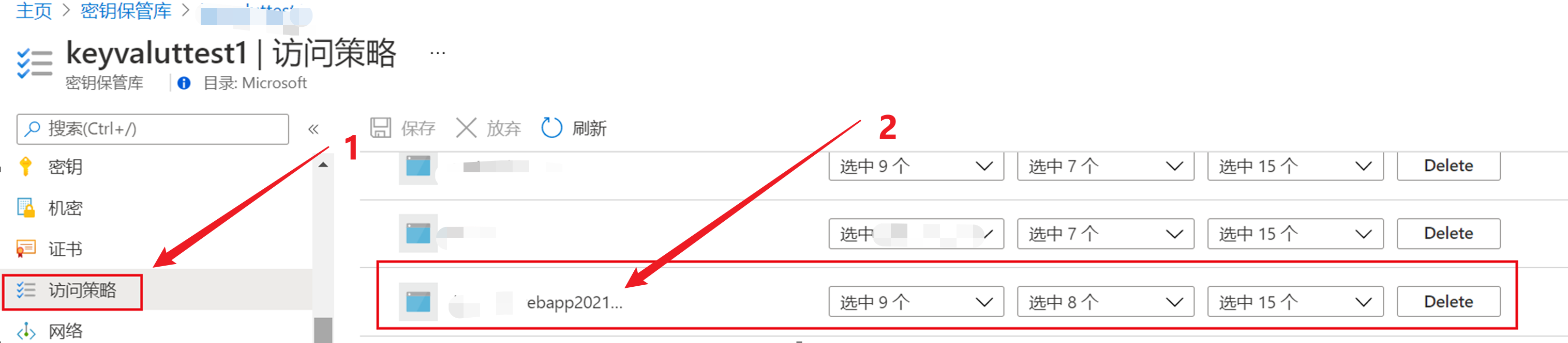 3)在Key Vault的访问策略页面中,为第二步创建的标识赋予访问Key, Secret,Certificate的权限。