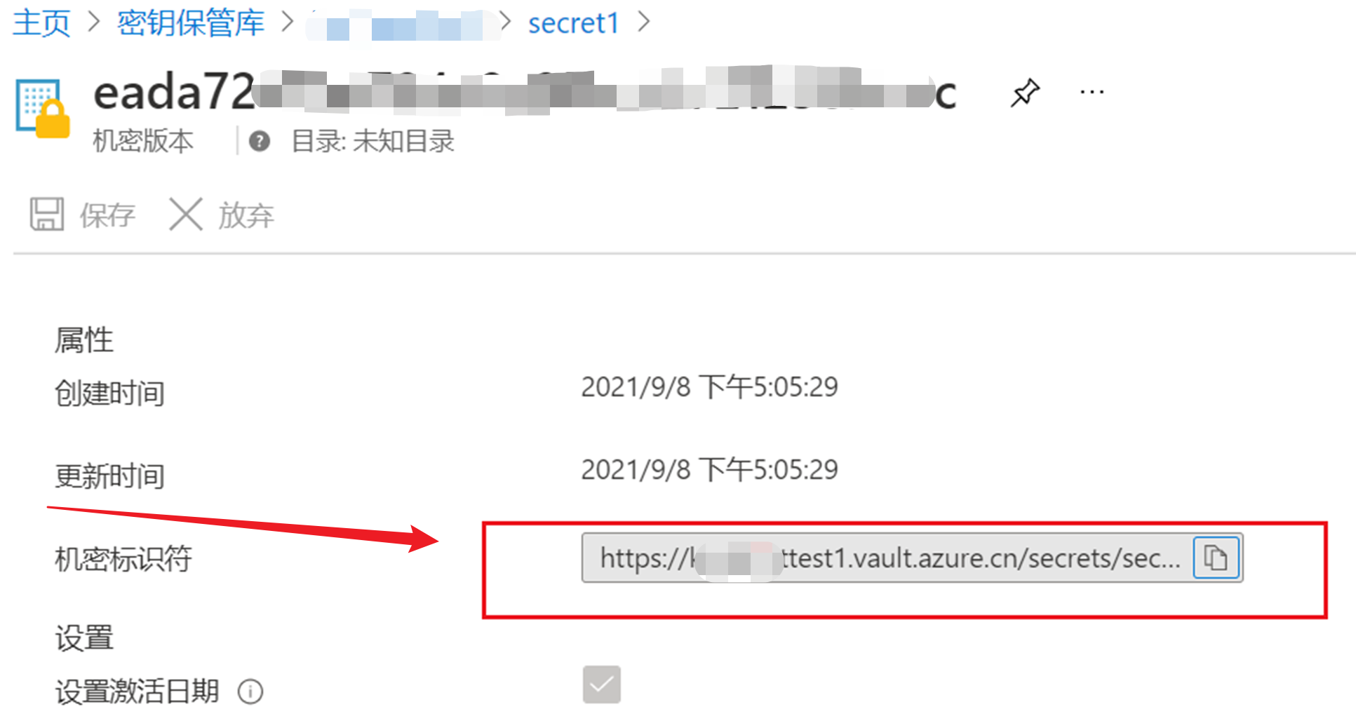 配置好权限后,进入机密页面,获取访问机密的URL(机密标识符)。如:https://<yourkeyvaultname>.vault.azure.cn/secrets/secret1/