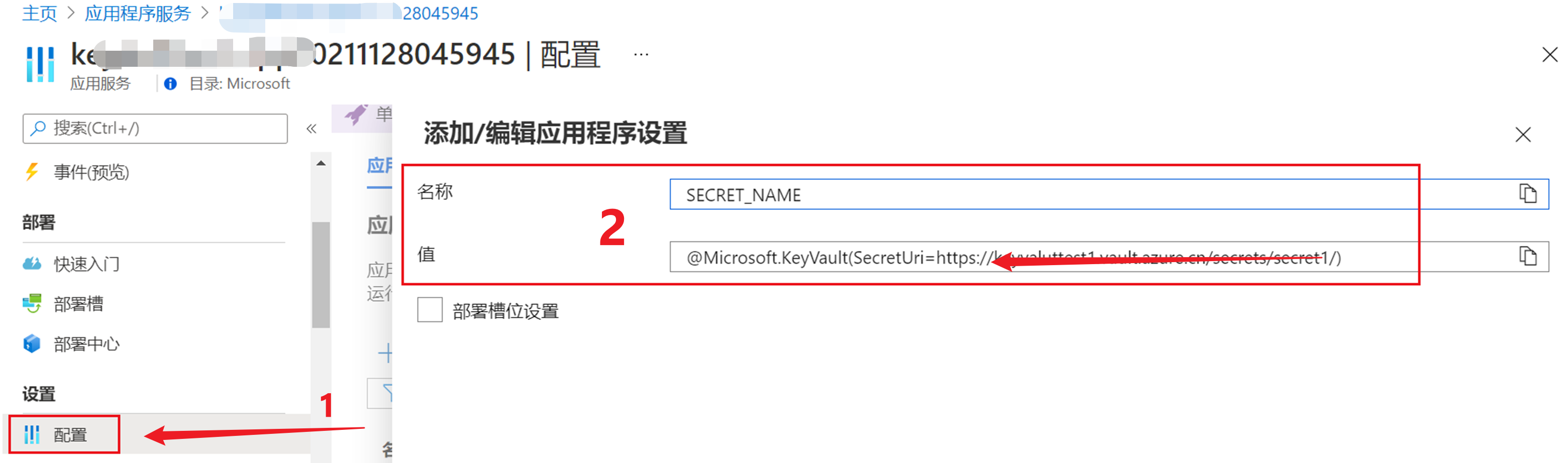 4)回到App Service 配置页面,在应用程序配置中添加与Key Vault 中机密对应的信息, 完整的引用语句为:
