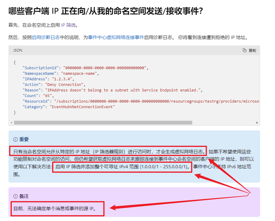 哪些客户端 IP 正在向/从我的命名空间发送/接收事件?https://docs.azure.cn/zh-cn/event-hubs/troubleshooting-guide#what-client-ips-are-sending-events-to-or-receiving-events-from-my-namespace