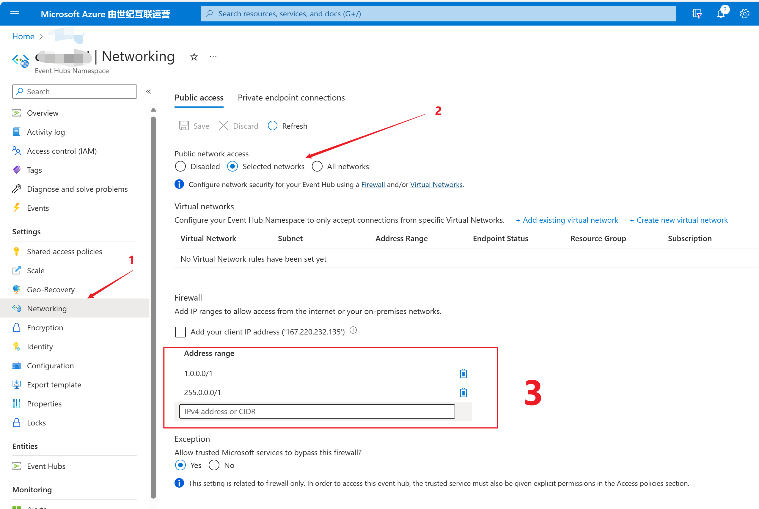 第一步: 在Azure Event Hub的Networking中添加整个IPV4网段