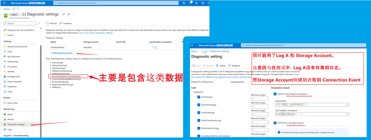 如果需要查看Event Hub 服务端的日志,可以在Azure门户上开启诊断日志来查看。默认情况下,我们并不能看见Event Hub的生产者,消费者端所使用的IP地址。