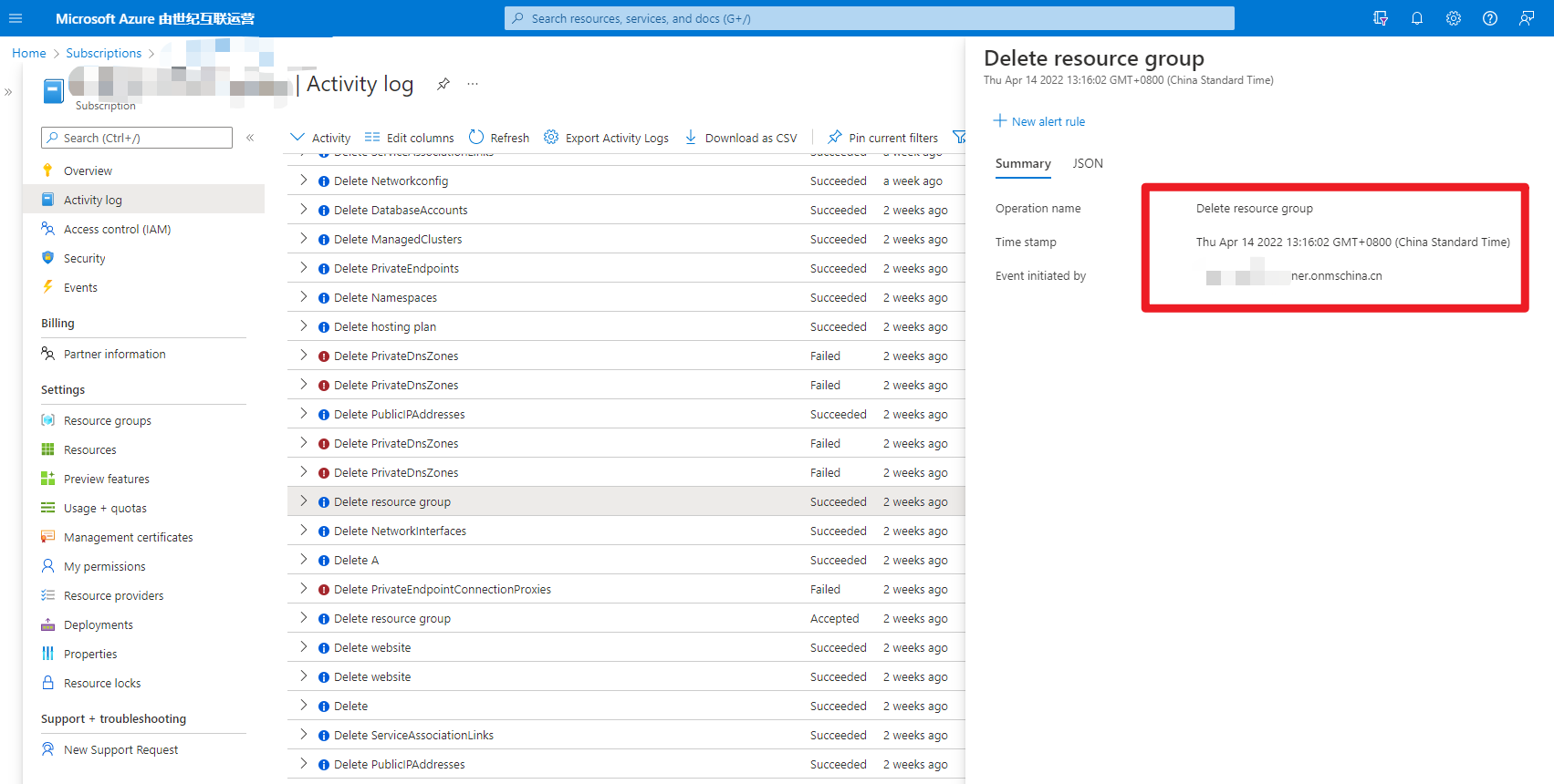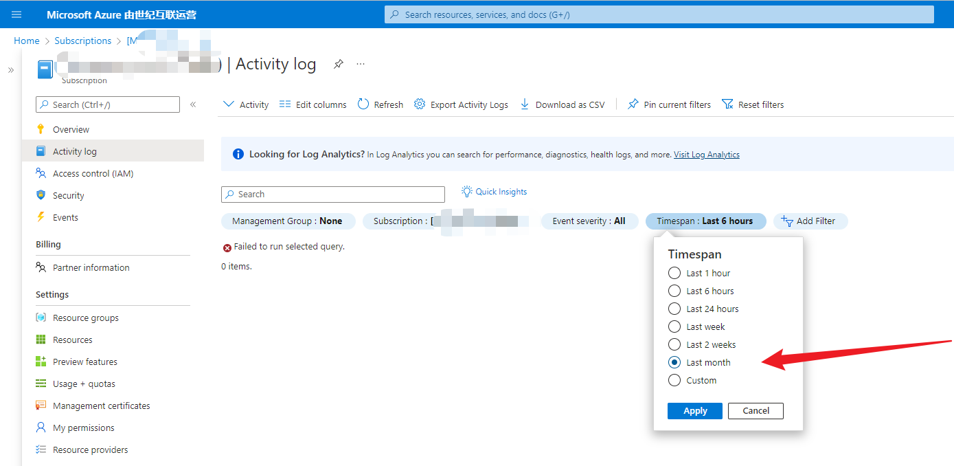 选择该订阅,然后选择左侧“活动日志”