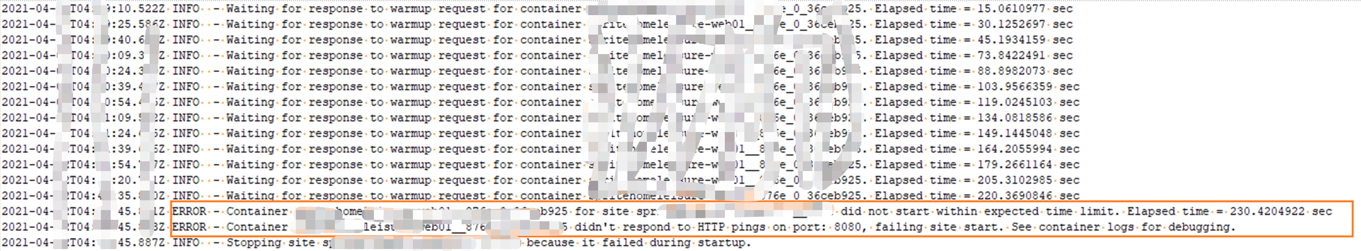 NodeJS项目部署在App Service For Linux环境中,部署完成后应用无法访问,在启动日志中发现错误消息:ERROR - Container XXX_0 for site XXX did not start within expected time limit. Elapsed time = 230sec