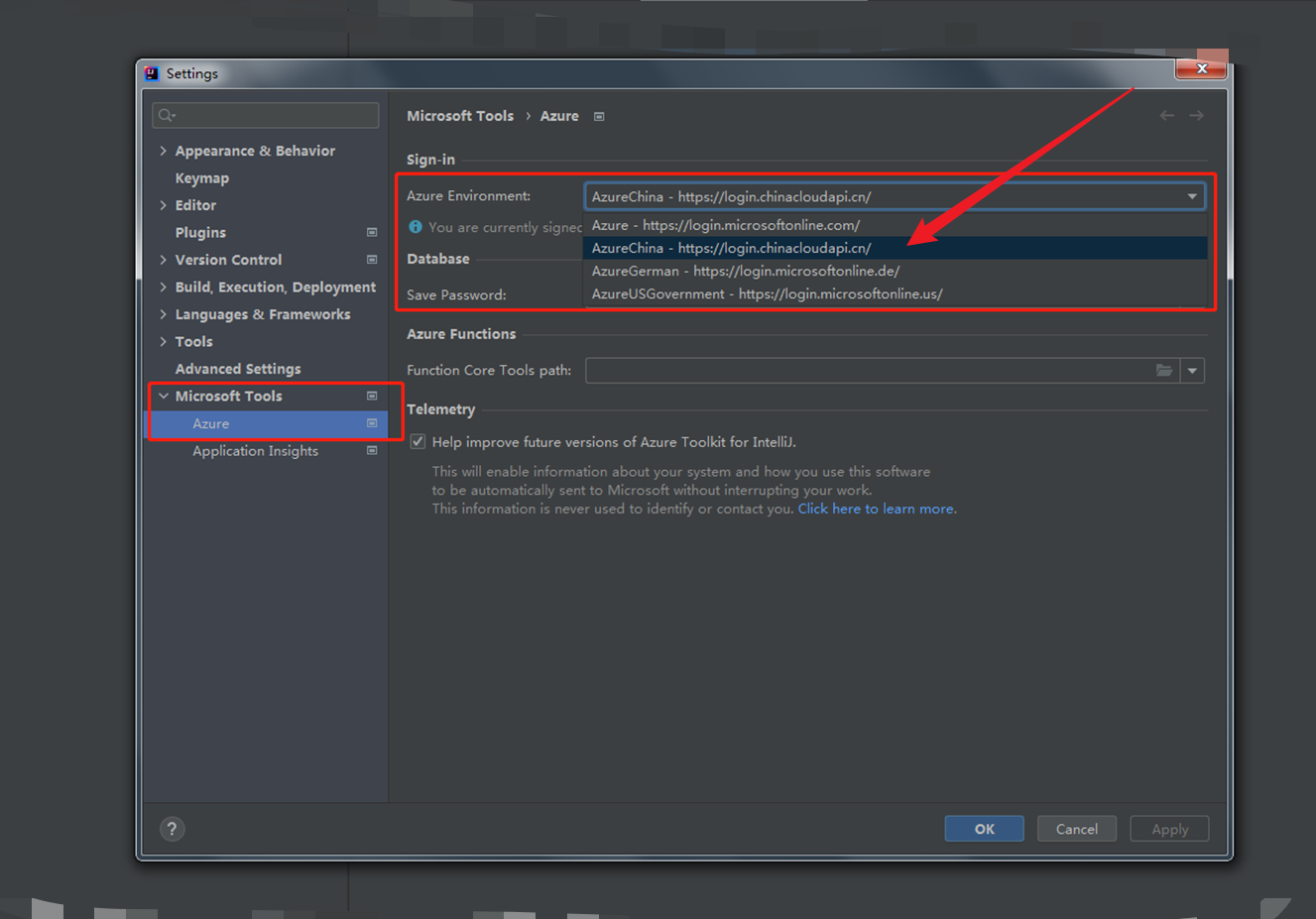 另一种更简单的方式是:在IntelliJ安装Azure插件后。进入Settings窗口 --> Microsoft Tools --> Azure Environment 种,选择Azure China。如下图:
