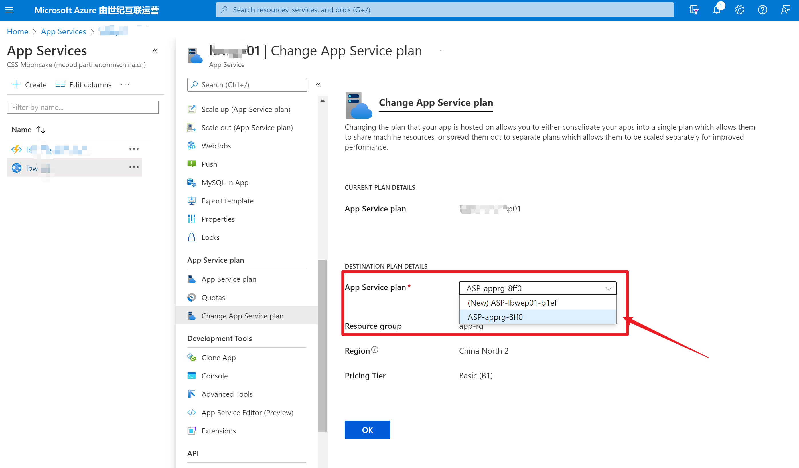 第二步:进入Change App Service Plan页面,点开App Serivce Plan的下拉列表。