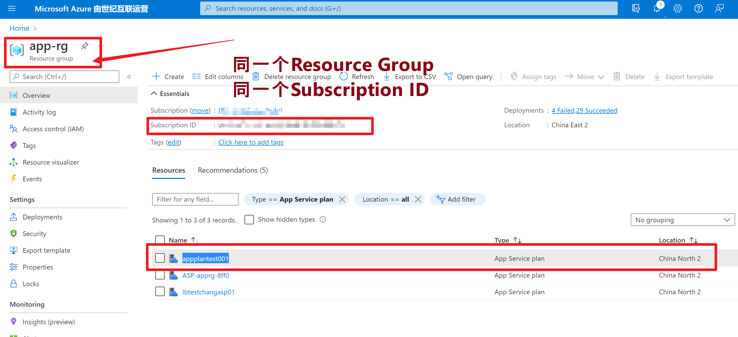 但是,为什么它显示不出来同一个资源组,同一个订阅号下面的,需要的appplantest001这一个App Service Plan呢?