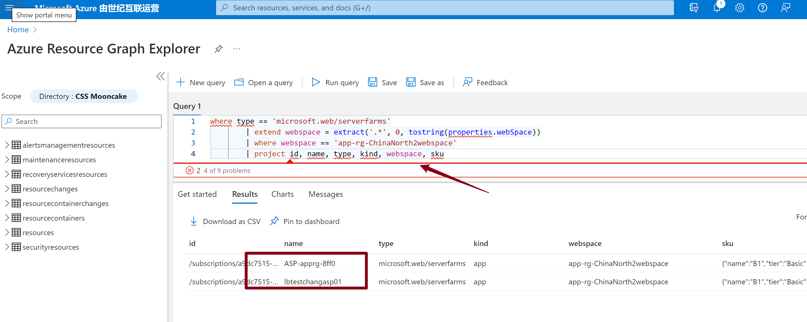 当拿到第四步的过滤条件后,这里非常明显是一个 Azure Resource Graph的查询语句,可以通过Azure Resource Graph Explorer页面来进行验证:Azure Resource Graph Explorer - Microsoft Azure 由世纪互联运营