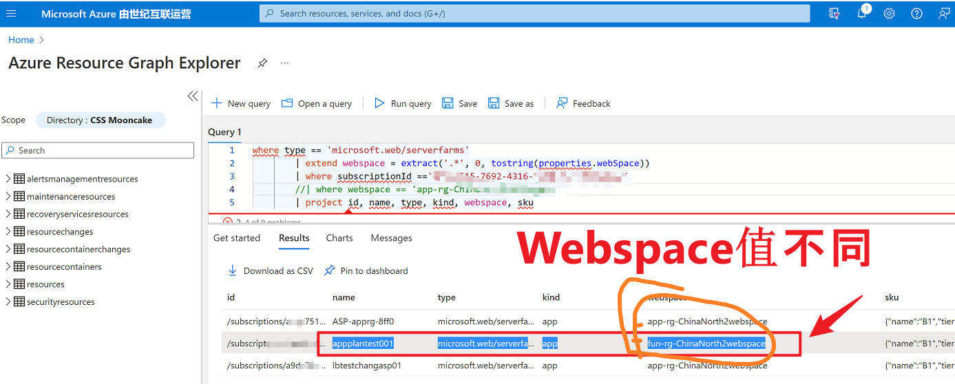 放宽以上语句的Where条件,指过滤当前订阅号下的App Service Plan,对比看一看webspace是否相同: