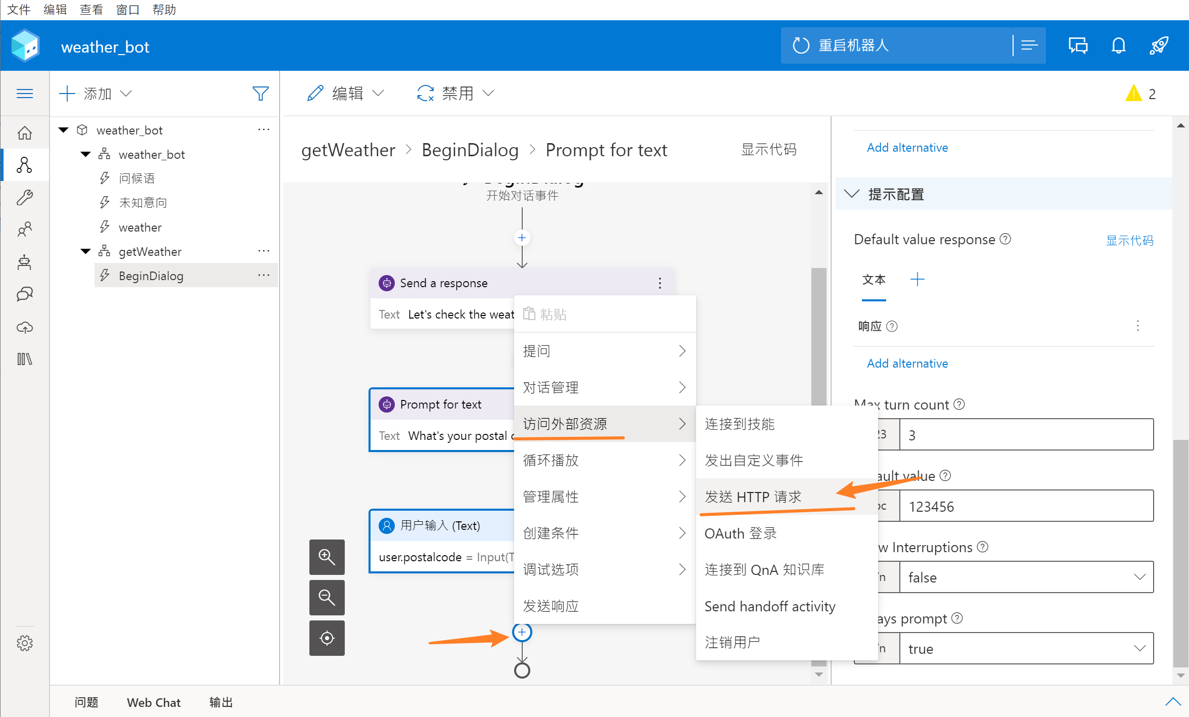 第一步:在“getWeather”的对话中,选择编辑区中最下面的“+”按钮,添加一个“访问外部资源”-->“发送HTTP请求”