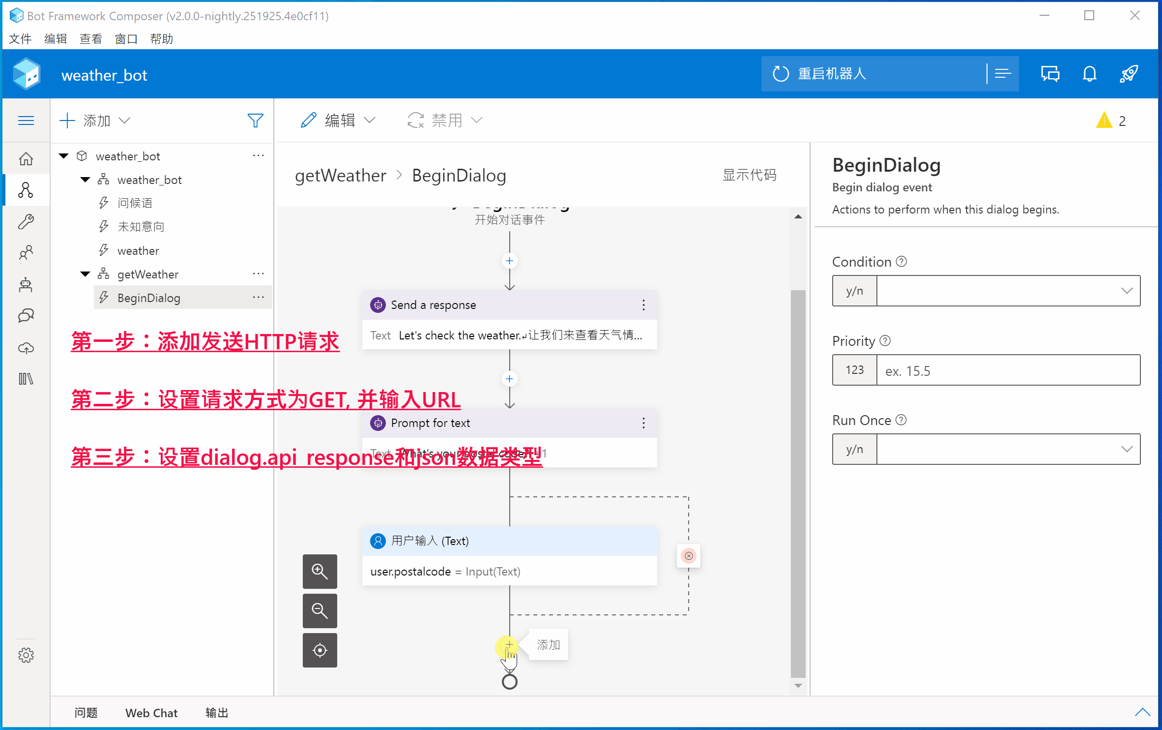 现在,机器人已经将用户输入的邮政编码存放在user.postalcode 属性中。 接下来,将在 HTTP 请求中将该属性的值传递给天气服务API。