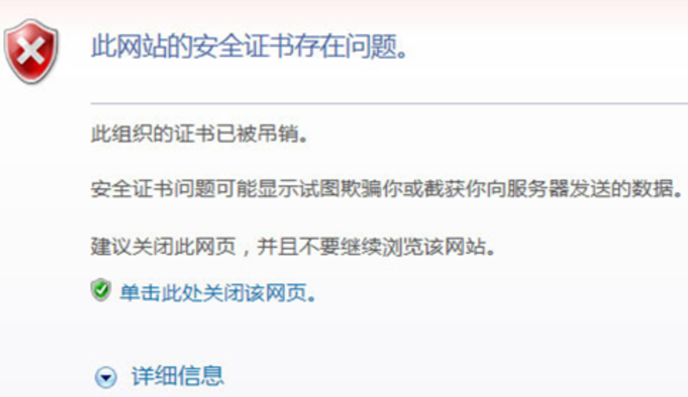 浏览器在使用 https:// 访问已经部署了 SSL 证书的网站时,一定会先检查此 SSL 证书是否已经被吊销,也就是说会查询吊销列表或 OCSP 服务, 如果此证书已经被证书颁发机构吊销,则会显示警告信息: “此组织的证书已被吊销。安全证书问题可能显示试图欺骗您或截获您向服务器发送的数据。建议关闭此网页,并且不要继续浏览该网站。 ”