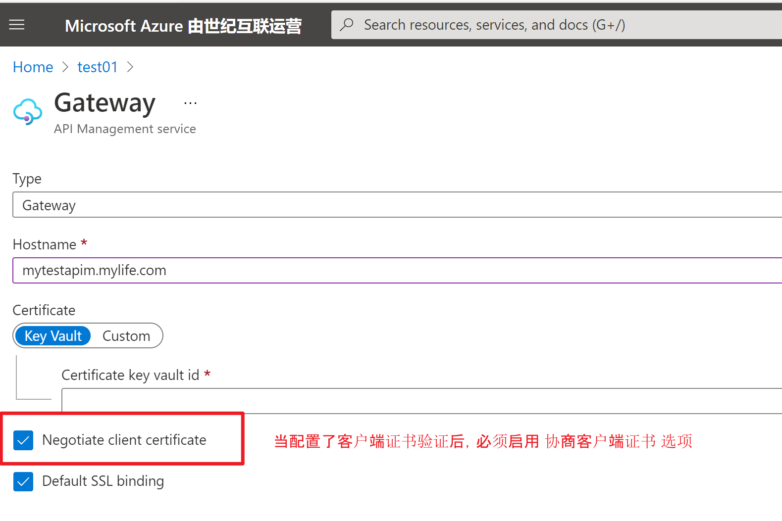 特别注意:APIM中如果要验证客户端证书,必须在设置“自定义域名”时,启用 “ Negotiate client certificate ”,避免 "No client certificate received." 的错误。这是因为只有当 negotiateClientCertificate 这个属性设置为true的时候才会请求证书,默认情况下是false。
