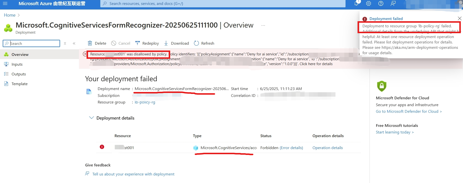 下面将介绍使用Deny策略来阻止创建 Azure AI services 中的 Document intelligence资源。