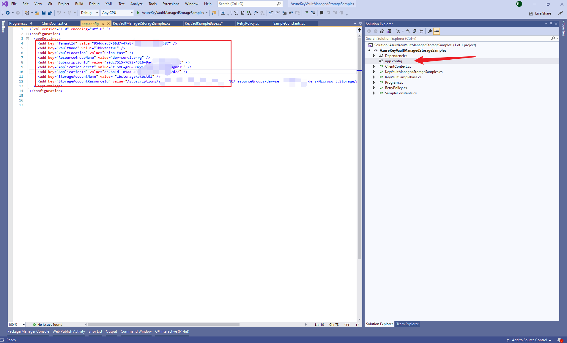 用VS 2019打开后,编辑app.config文件, 配置tenant, subscription, AD app id and secret, and storage account and its resource id等值