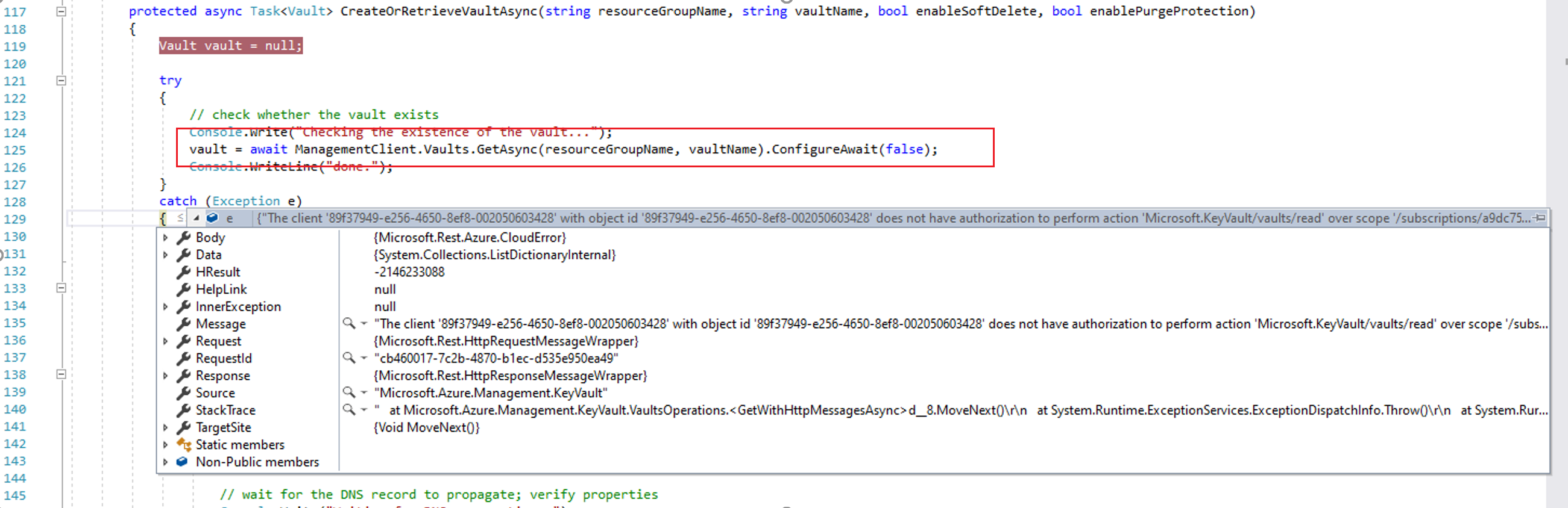 第二个错误:Microsoft.Rest.Azure.CloudException | HResult=0x80131500 | Message=The subscription 'xxxxxxxx-xxxx-xxxx-xxxx-xxxxxxxxxxxx' could not be found. | Source=Microsoft.Azure.Management.KeyVault