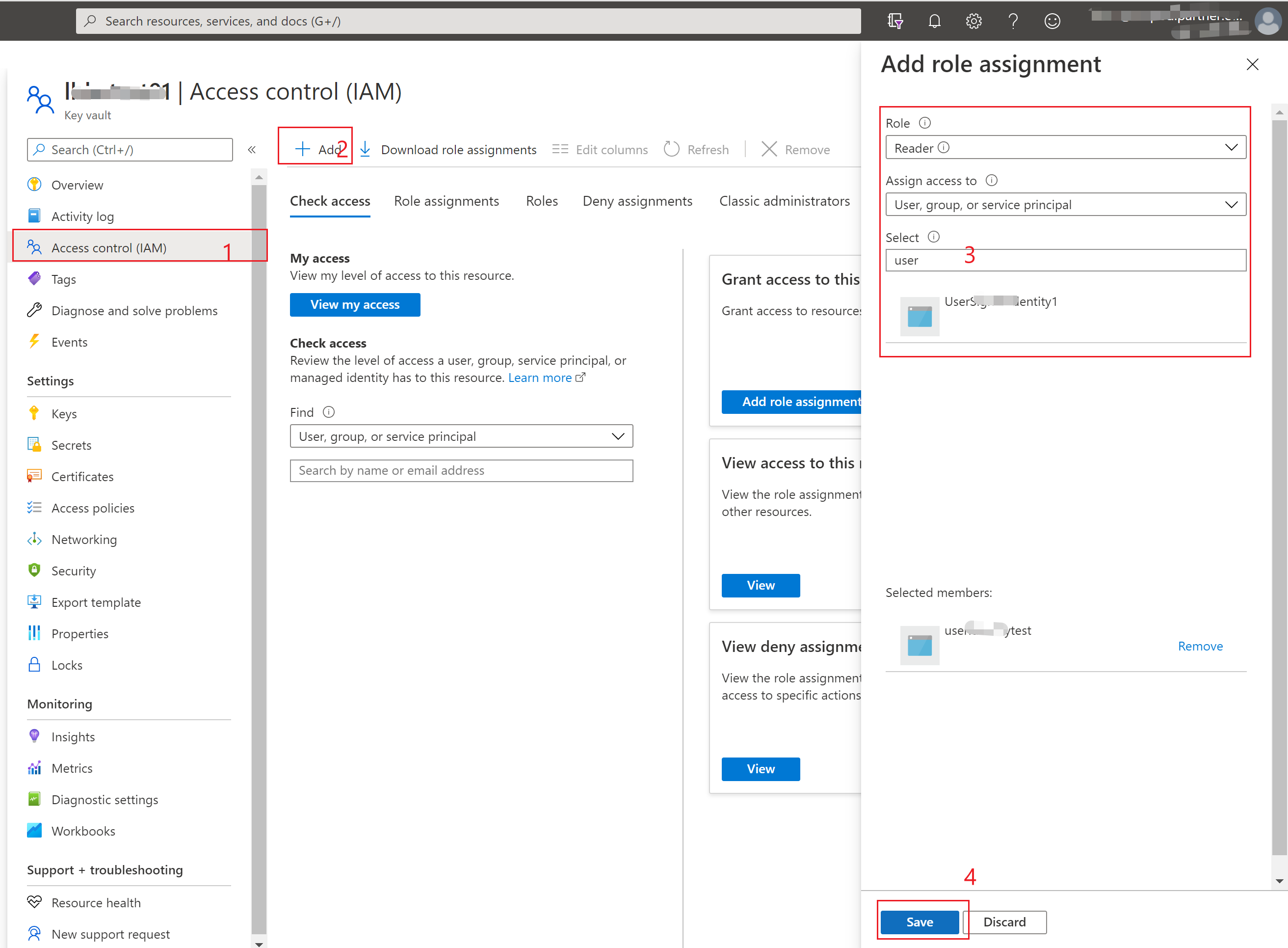 - Key Vault Portal -> Access Control(IAM) -> Add Role Assignment.