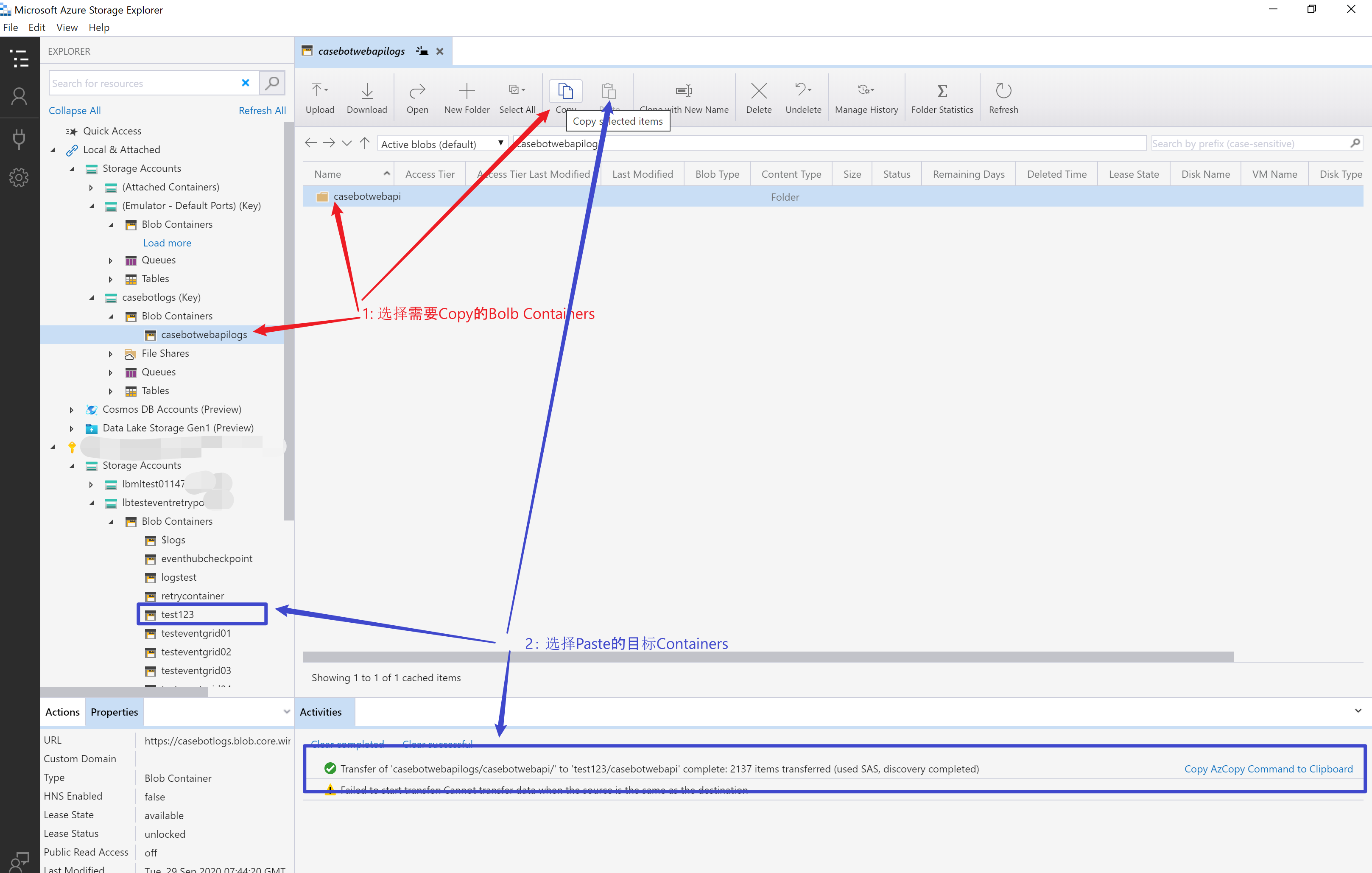 **可以。**通过Azure 官方推荐的Storage Account工具来完成 Copy/Paste 操作。操作步骤如下图: