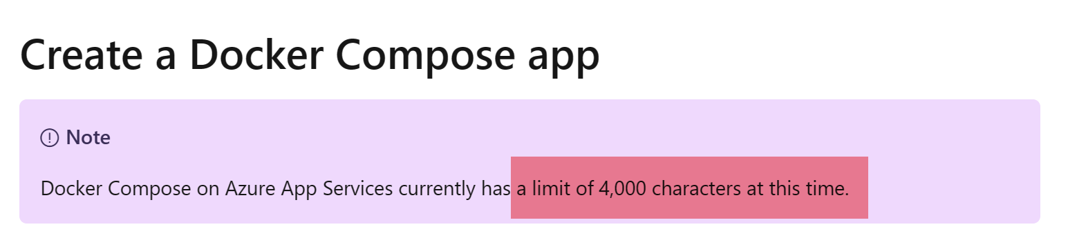这是因为App Service 会把 Docker compose.yml 文件中的内容以Base64格式编码后,赋值给Linux Version。而Linux Version的长度限制为4000个, 这是App Service For Linux平台限制,无法修改。