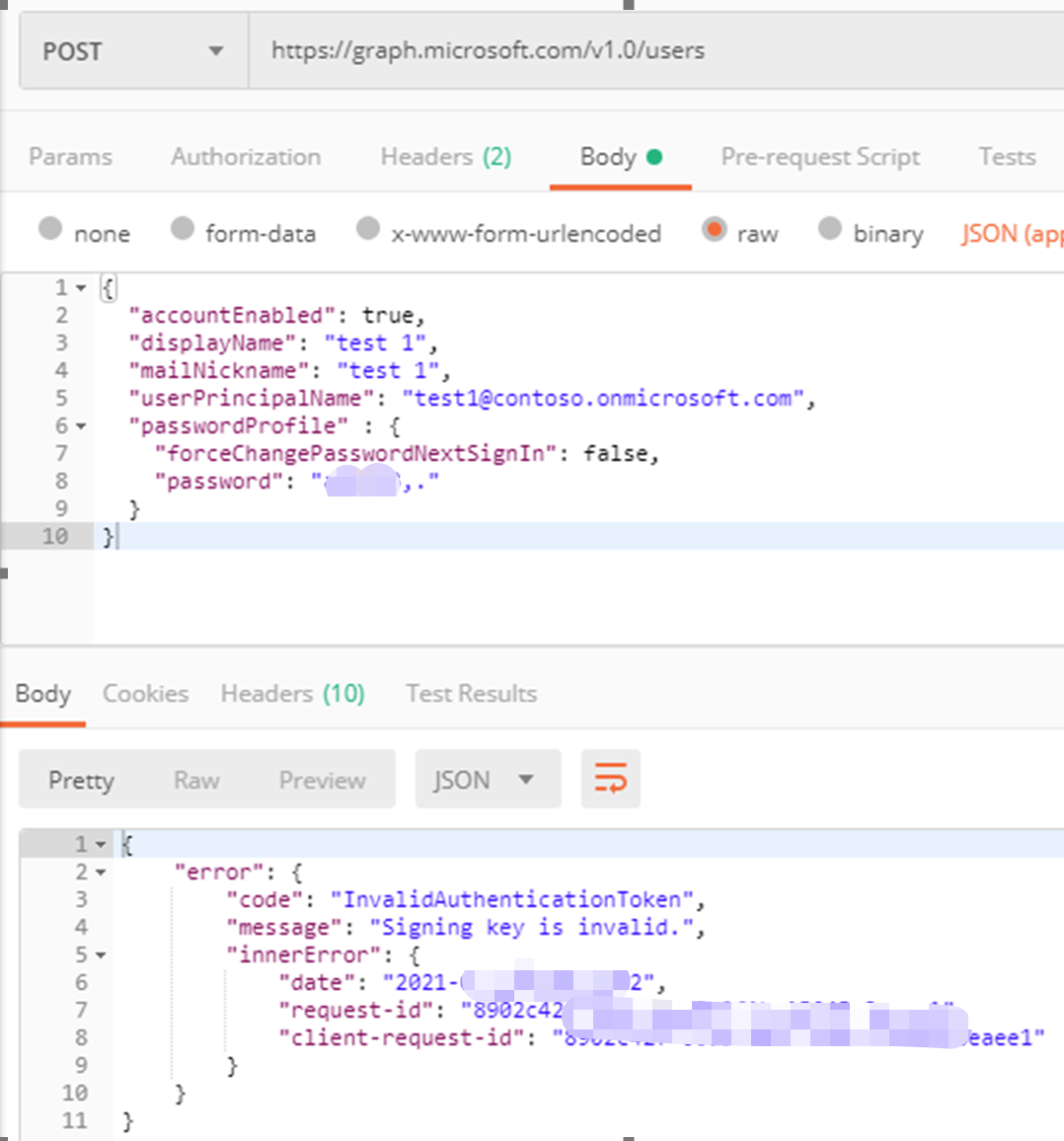 1){ "code": "InvalidAuthenticationToken", "message": "Signing key is invalid.", }