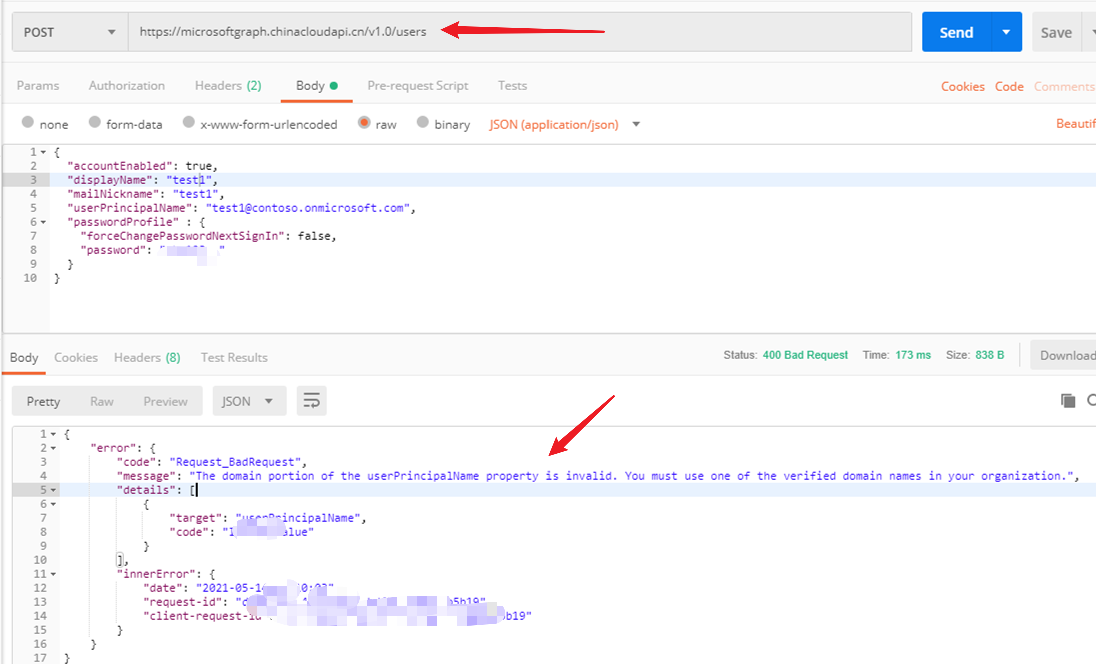 这个 "The domain portion of the userPrincipalName property is invalid".表明参数userPrincipalName的domain部分要和AAD中组织(tenant)名称中的名称一致。